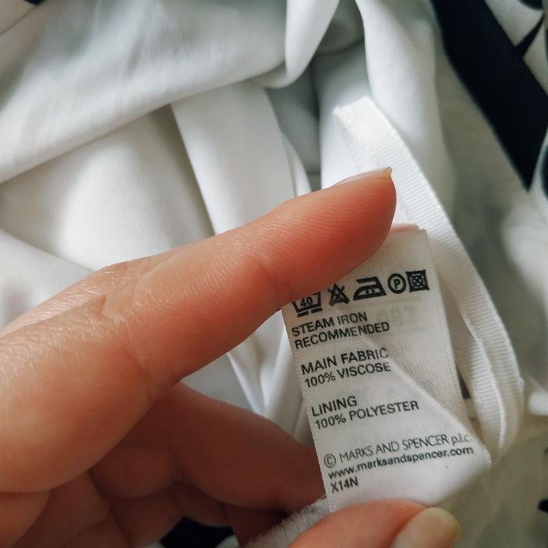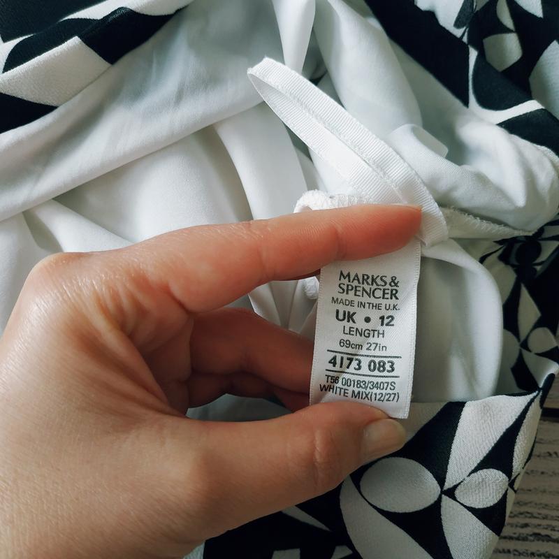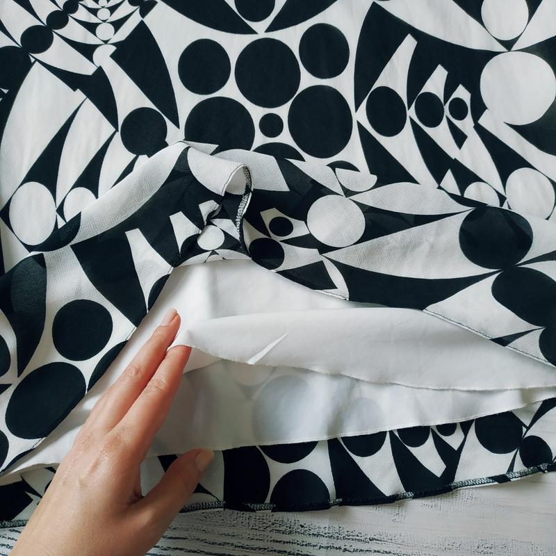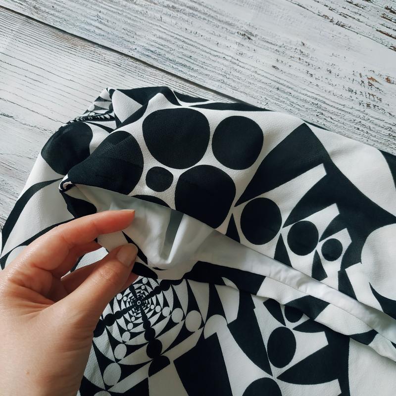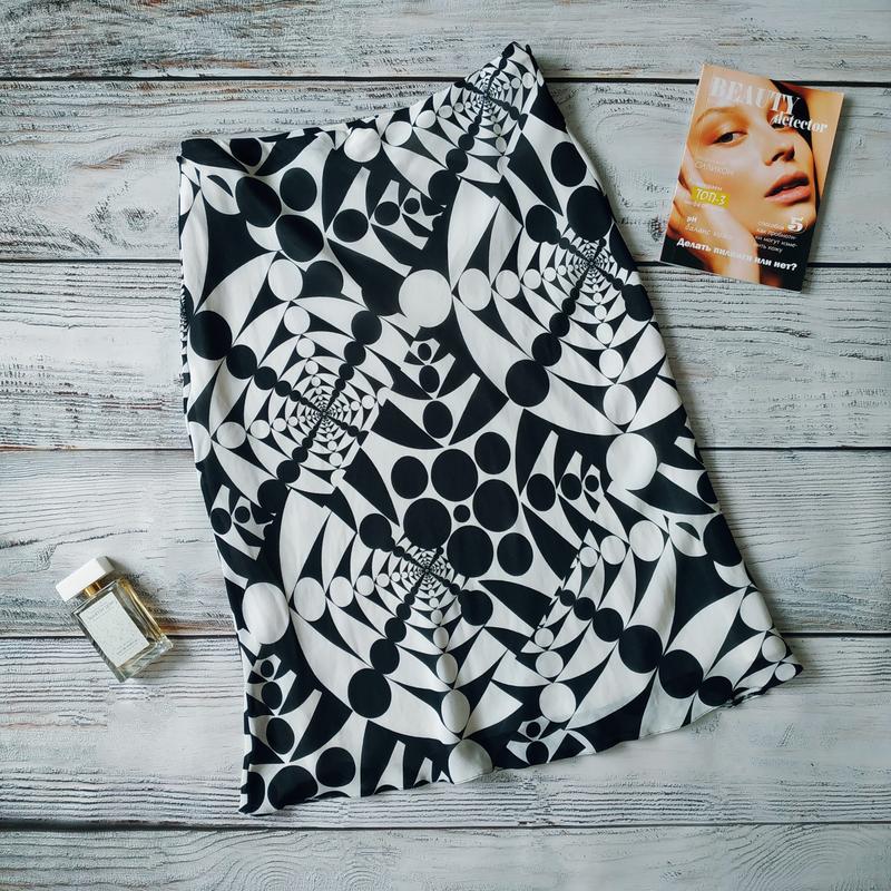 Юбка длины миди из вискозы в чёрно-белый геометрический принт. В талии резинка. Есть подклад. Юбка скроена по косой, и хорошо садится по фигуре.Размер указан 40 EU или 12 UKДлина 73смПот 38см, тянется до 45смПоб 50см, тянется до 56смЦена 295грн