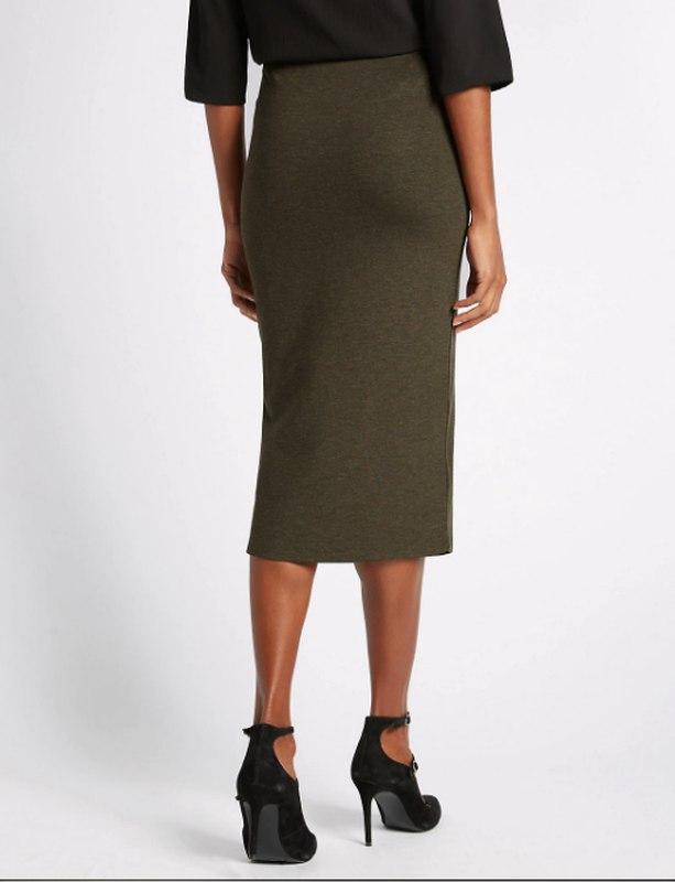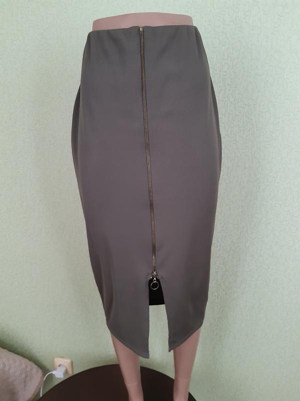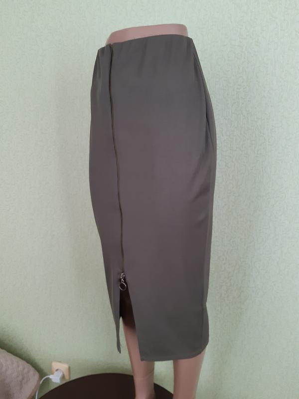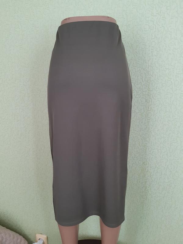 стильная юбка длина миди, их качественного текстурного трикотажа в рубчик, застегивается на молнию с кольцом спереди, красивый цвет хаки ( к сожалению камера плохо передала ), хорошо тянется отлично сидит( на манекен она большая на теле смотрится лучше), талия 35( макс 43), бедра 48( макс 55), длина 73