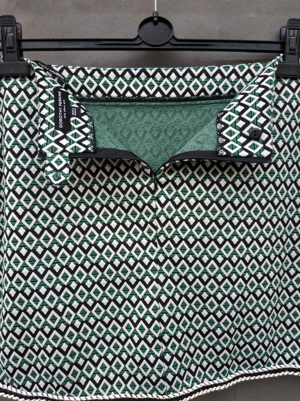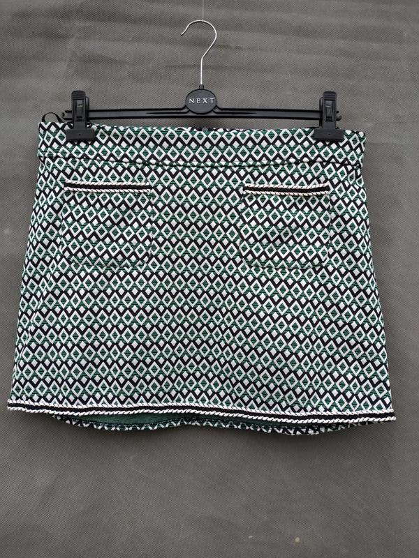 юбка А силуэта со спины застегивается на молнию и пуговицу, без шлицы. спереди юбка украшена карманным и декоративным кантом. пояс из ткани. ткань плотная, юбка без подкладки. состояние новой вещи без бумажных бирок. без нюансов.