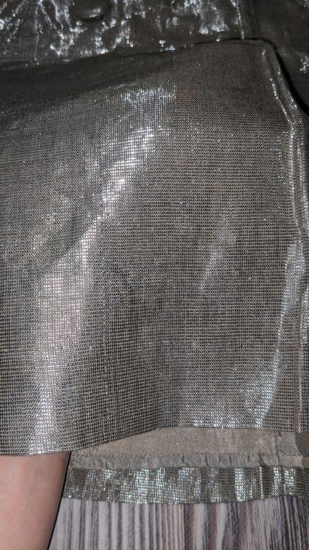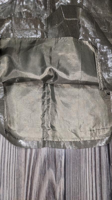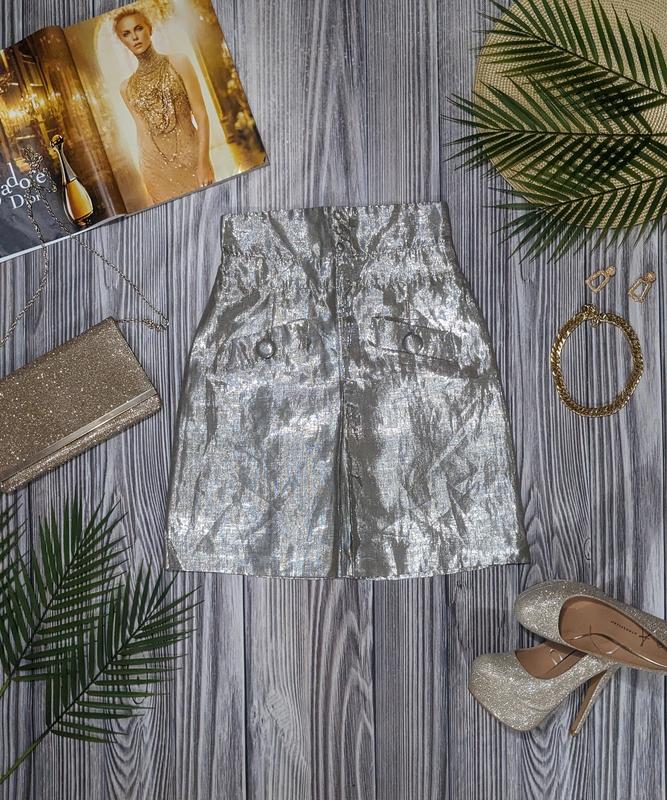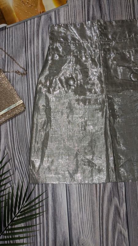 Неймовірна блискуча коротка спідниця. Висока посадка. На тонкій підкладці. Застібається ззаду на приховану блискавку. Є передні кишені котрі застібаються на великі гудзики. Тканина тонка льон з срібним люрексом. Гарно блищить. Підкладка з тонкої підкладочної тканини. Не колеться, приємна до тіла, не тягнеться, не просвічується.