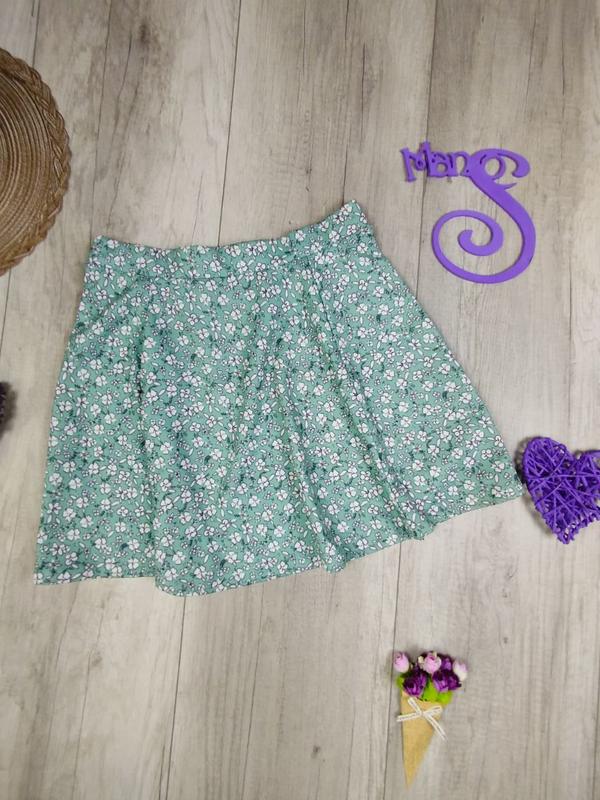 Женская летняя короткая мини-юбка FB Sister. Расклешенная. Цвет салатовый с цветочным принтом. Ткань плотная. Пояс на резинке. Состояние б/у, в отличном состоянии Производитель FB Sister Страна-производитель Мьянма Состав 95% полиэстер, 5% эластан Замеры: полуобхват талии 39 см (тянется до 43 см), полуобхват бёдер 63 см, длина 43 см