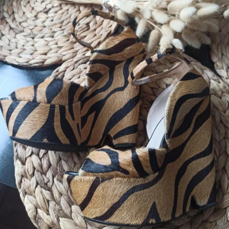Стан - идеальный. Оригинальный, производство Испания. Размер 39, стелька 25 см. На ногу 24-24, 5 см идеально.Платформа: перед 5 см, сзади 15 см. Тигровый украшение, натуральный мех. Тренд лета 2023 лет! Безопасной оплаты, возврата и обмена нет!