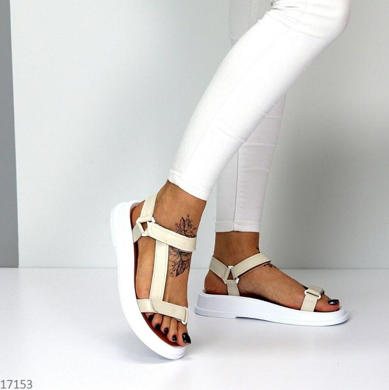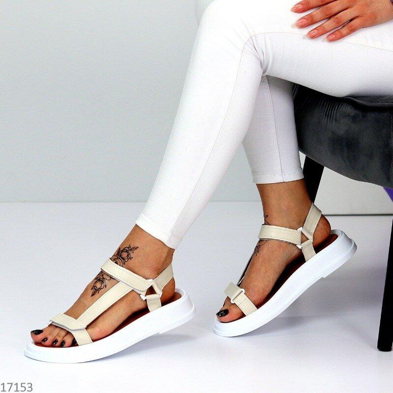 Материал: натуральная кожа, цвет - светлый беж, подошва - белая, фиксируются с помощью липучек спереди и на подъеме.