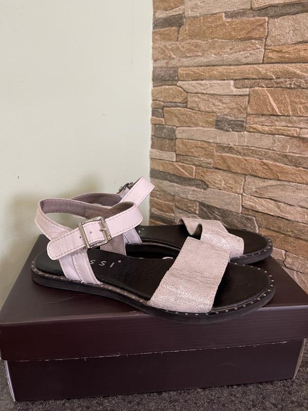 Босоножки очень хорошего качества В натуральной коже Белого цвета с блестками Плоская подошва Стан 10/10