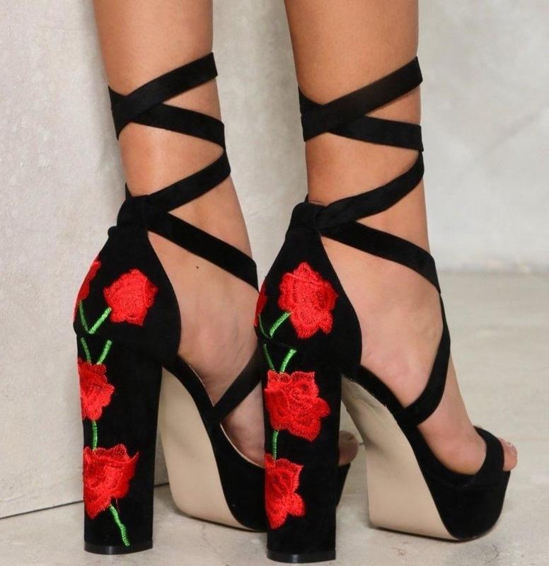 Взлетайте к новым высотам. Босоножки на каблуке Believe In Me изготовлены из гладкой искусственной замши и имеют эффектную вышивку роз яркого красного цвета, смелую платформу, массивный каблук и ремешок, привлекающий внимание спереди. Стелька 24см