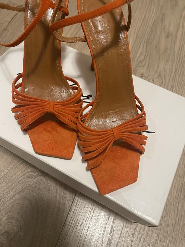 39 розмір. По устілці 25 см від краю до краю.Підбори 10 см.Сліди носки тільки на підошві, взуті 1 раз.Ціну на цю модель на сайті прикріпила в фото.
