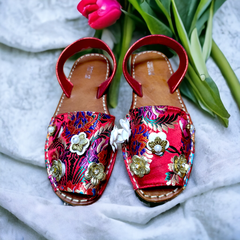 Вышивка, аппликация цветы, сверху жаккардовая ткань, внутри кожа.