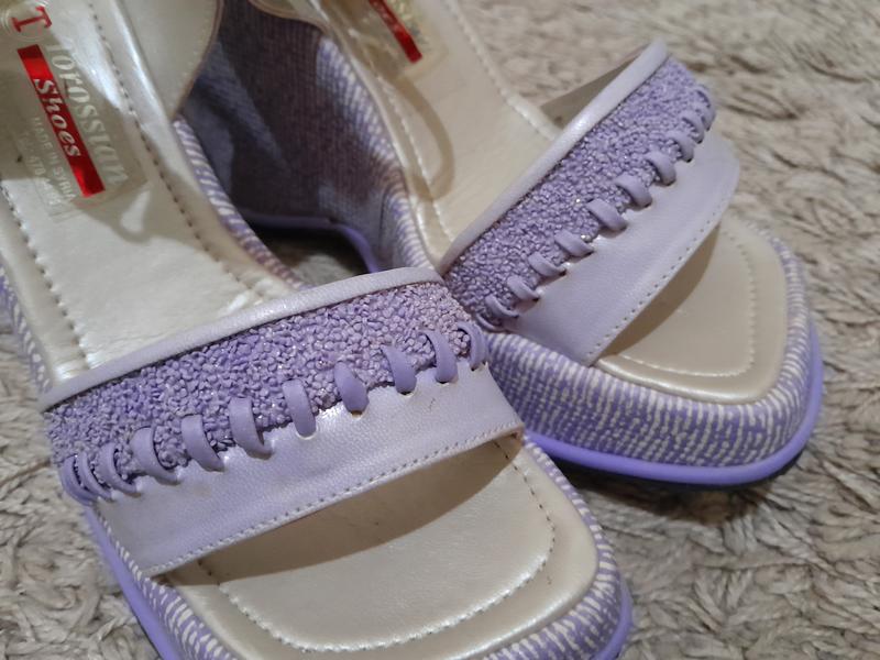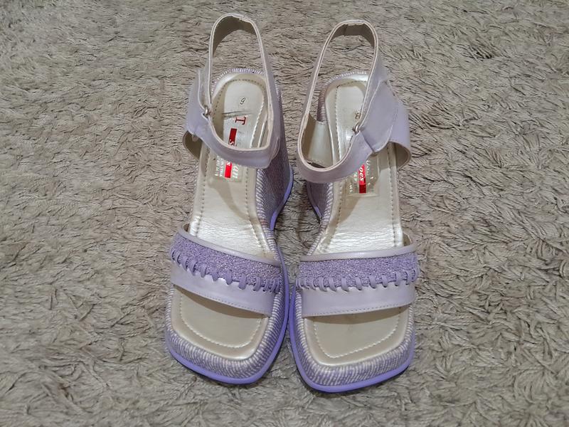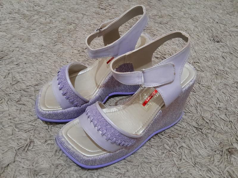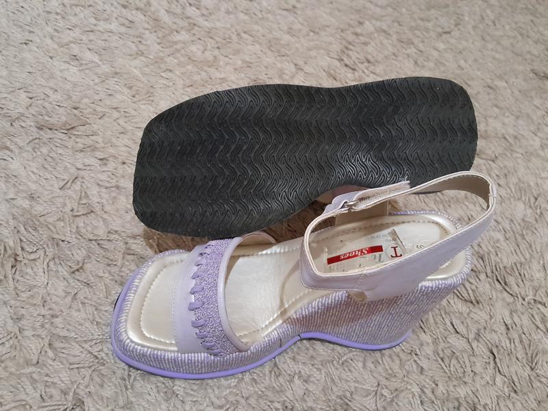 Босоножки Размер 38,39,40. По стельке: 38-24,5...39-25...40-25,5...Высота танкетки 11 см. Застёгиваются на липучке. Модель на среднюю ножку. Пары стояли на витрине(могут быть небольшие загрязнения)