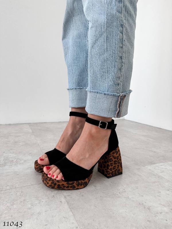 Код 11043 Босоножки цвет: ЧЕРНЫЙ + принт ЛЕО НАТУРАЛЬНАЯ ЗАМША+ВЕЛЮР (Шевро) стелька: кожподклад каблук - 9 см, платф. - 2 см Производство - Украина (=NA=) При отсутствии размера в наличии доступны под заказ 36= 23 см 37= 23,8 см 38= 24,3 см 39= 25,2 см 40= 25,7 см Вага 36 р= 670 г.