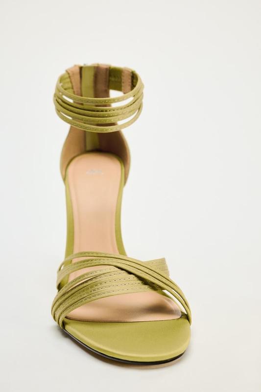 Босоножки на каблуке. Тонкие ремешки спереди и на щиколотке. Застегиваются на молнию сзади.