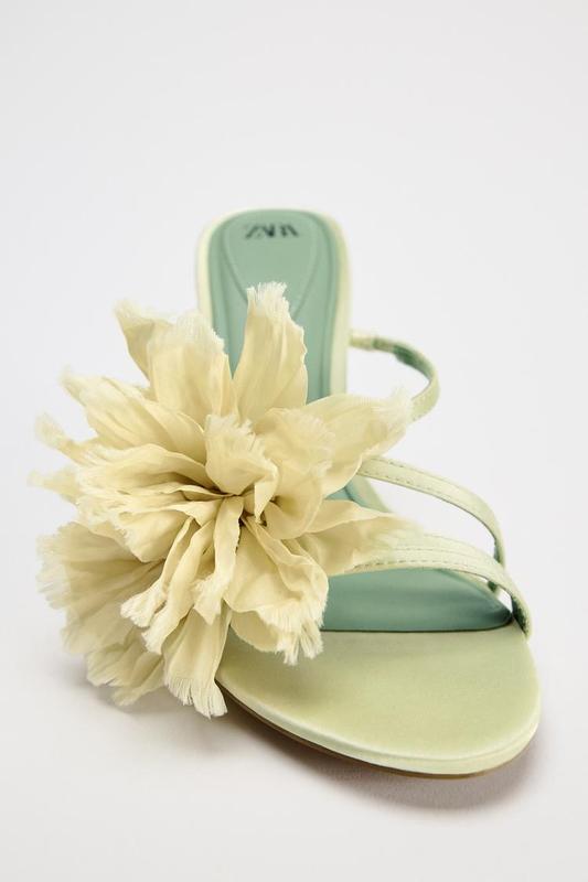 Босоножки на тонких каблуках. Большая аппликация в форме цветка сбоку и эластичные ремешки. Гострий носок.