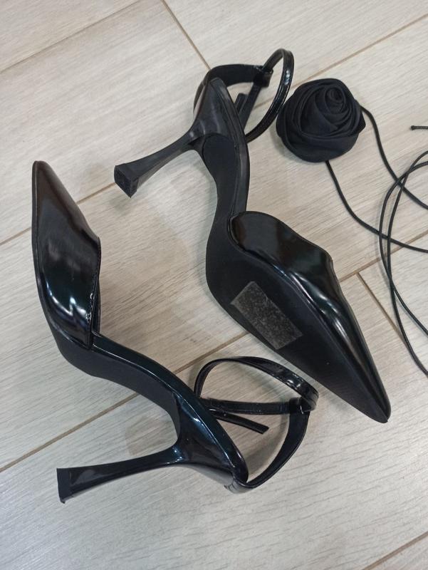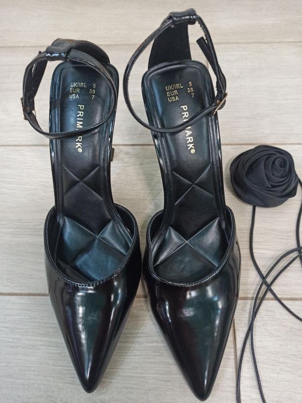 Босоніжки святкові вечірні випускні, з оригінальною застібкою, підбори "рюмочка", чорного кольору, лаковані, Primark. Розмір (38) стопи 24-24,5 см, висота підборів 9,5 см.