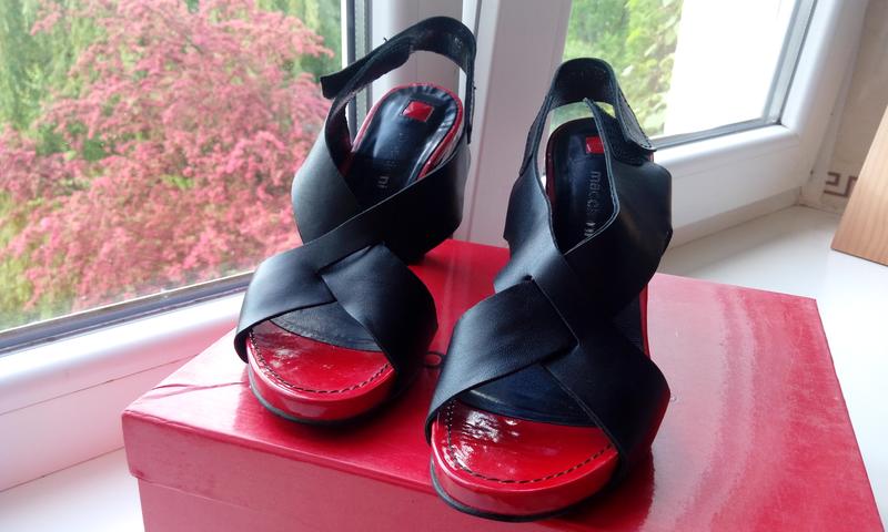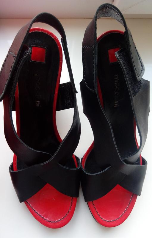 Очень красивые, комфортные босоножки. Каблук anti stress. Были одеты 2 раза очень аккуратно, видно на фото. Верх кожа, внутри кожа.