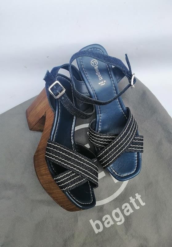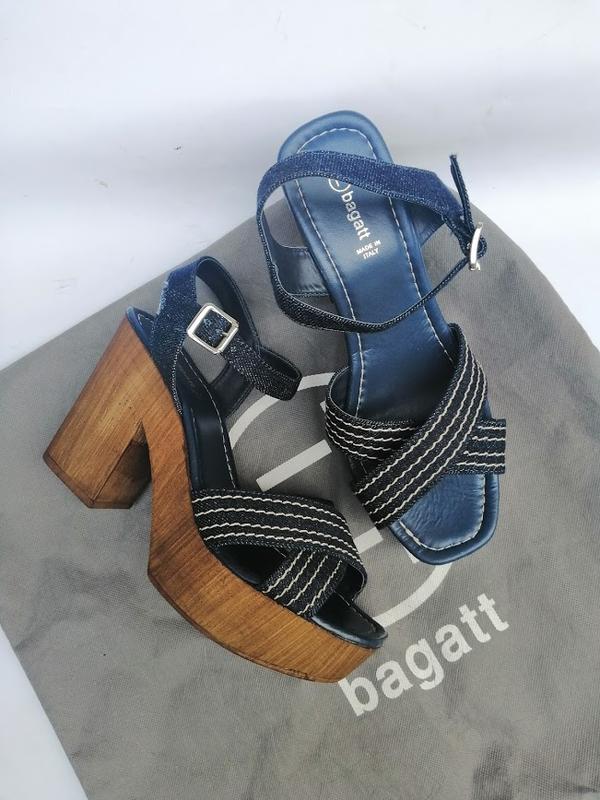 Baggat шикарные босоножки выполнены из натуральной кожи синего цвета и древесины.Размер 38 по стельке 25 смШирина по подошве 8,5 смВысота каблука 10 см, платформы 4 см