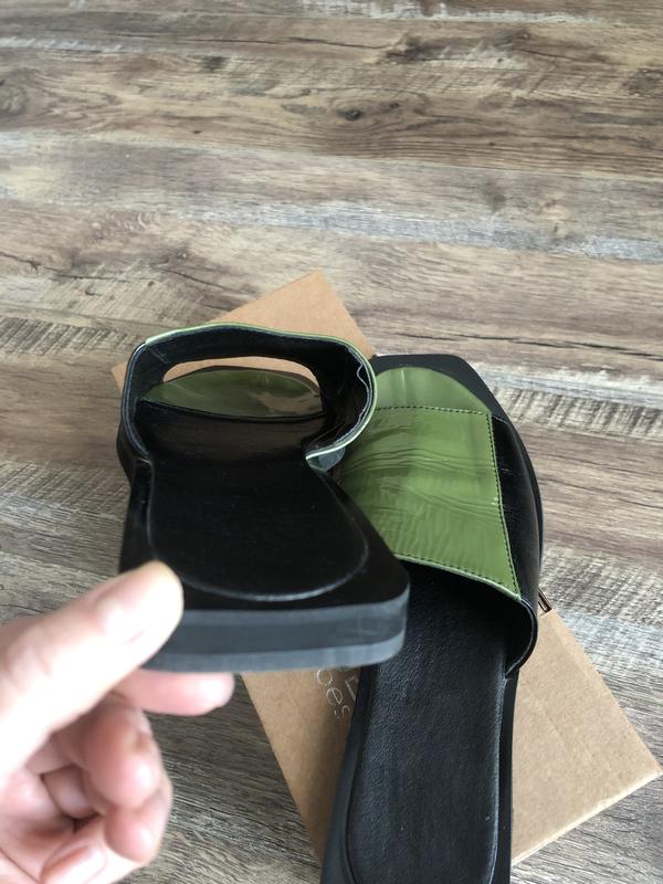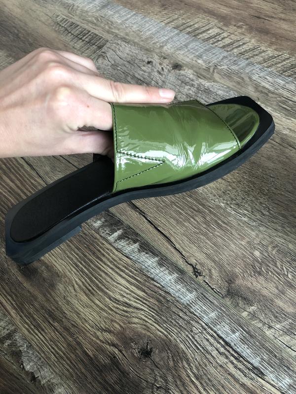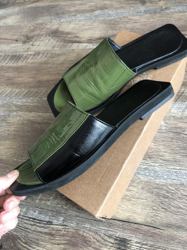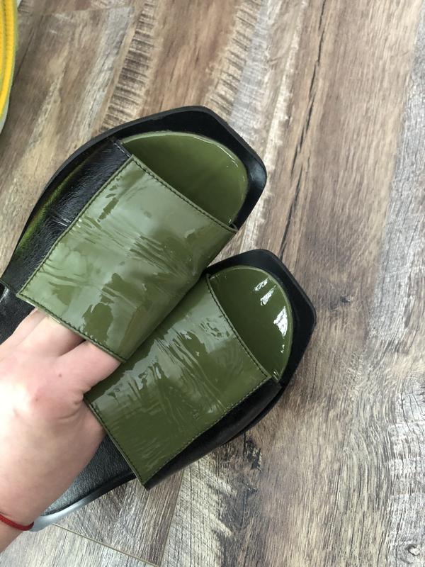 Очень красивые шлёпанцы, с квадратным носком и квадратной пяткой. Выполненные в двух цветах чёрный/оливковый, натуральная лаковая кожа, стелька кожаная, состояние идеальное