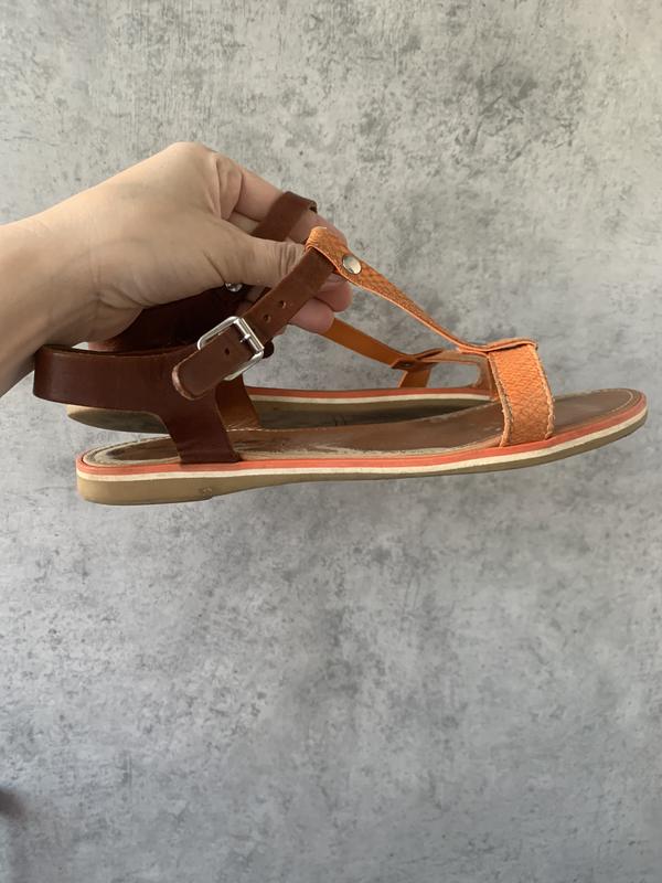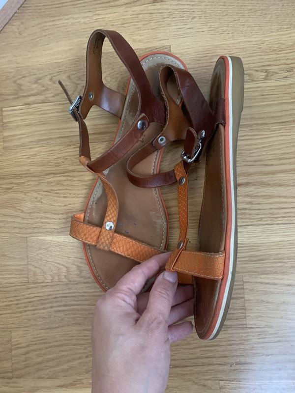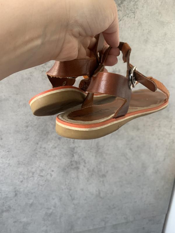 Легенькі,комфортні босоніжки,не відчутні на нозі! Шкіра,не парять,гарний стильний багатий колір Носилися реально кілька разів,все ж завеликі.Сліди носіння мінімальні