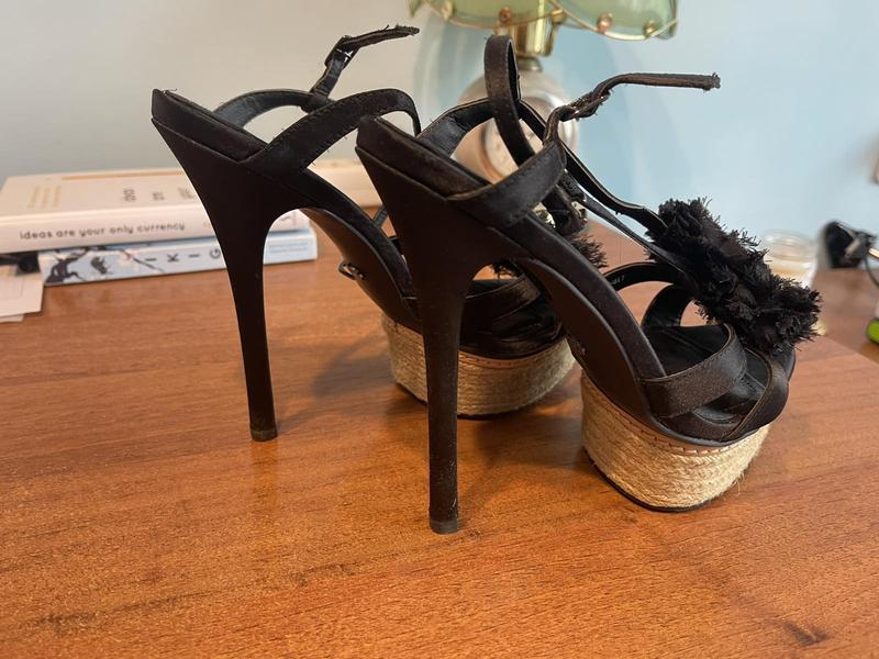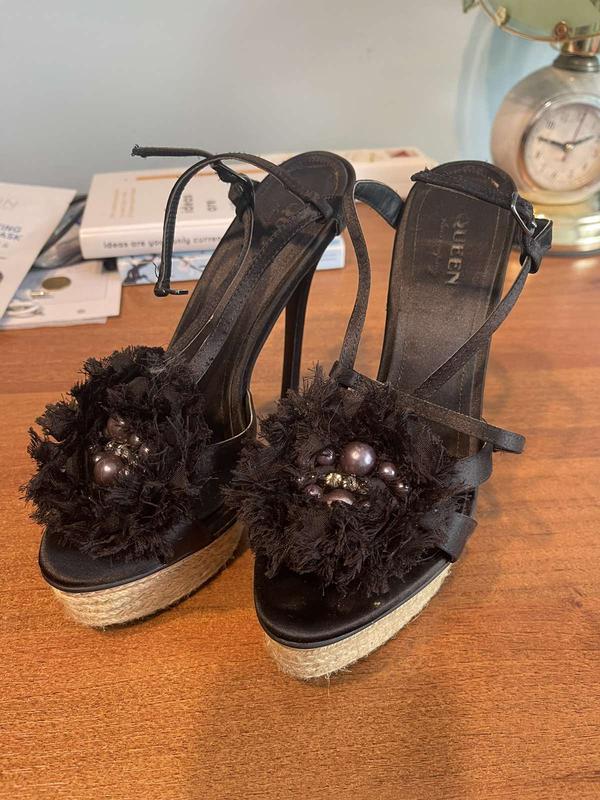Італійський бренд Queen shoes company. Розмір,38 маломірять, 23,5 см , взувались кілька разів, акуратні, елегантні босоніжки на свято, стійкі, каблук 12 сантиметрів з платформою 3,5 см. Нога в нихне змучується.