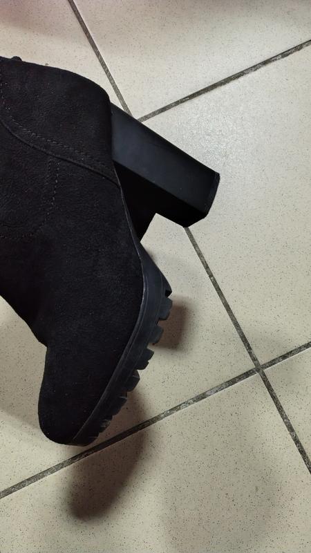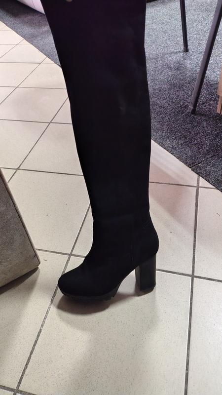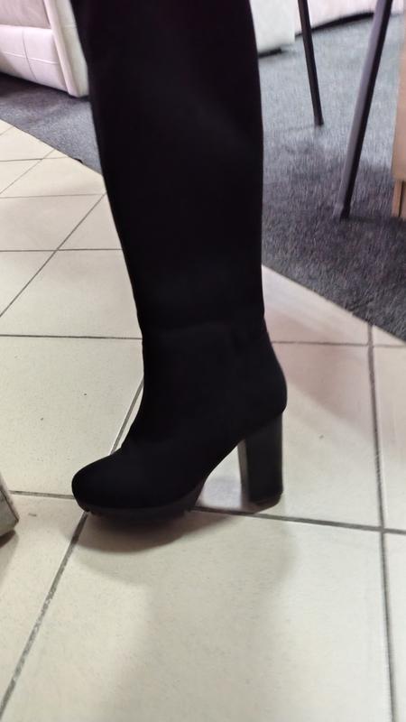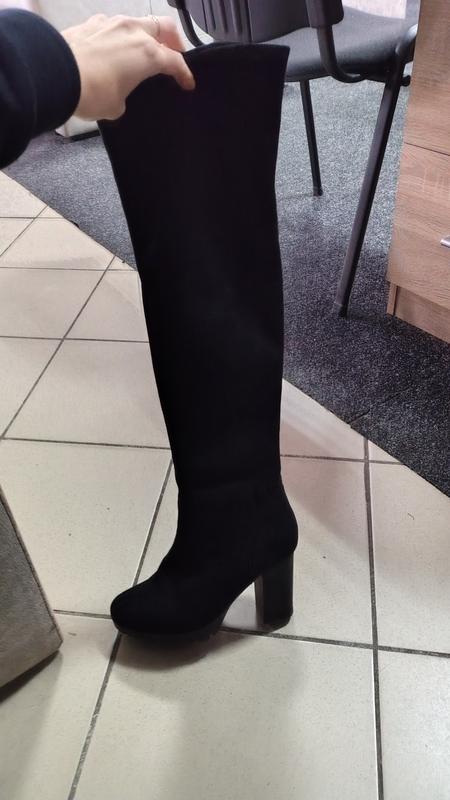 Покупала здесь, но размер не подходил.Продаю по цене вдвое меньше.Размер 38, потолка приблизительно 24-24,5,каблук 8 см. УстойчивыеЗакрывают колено, замша