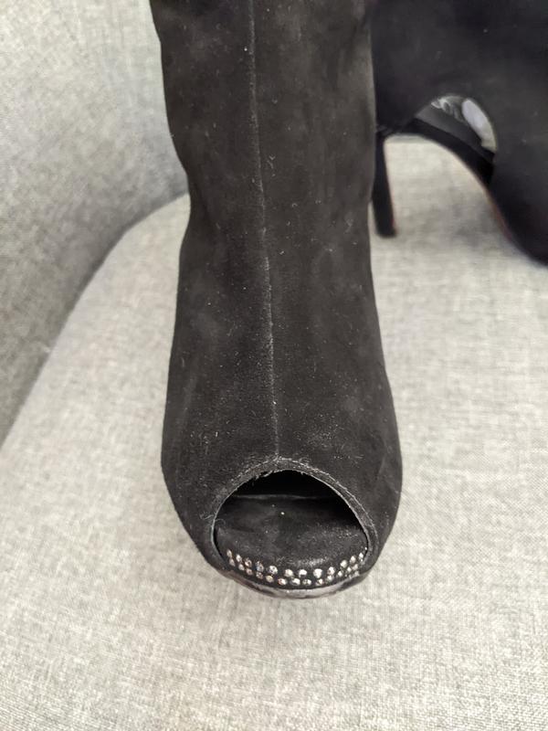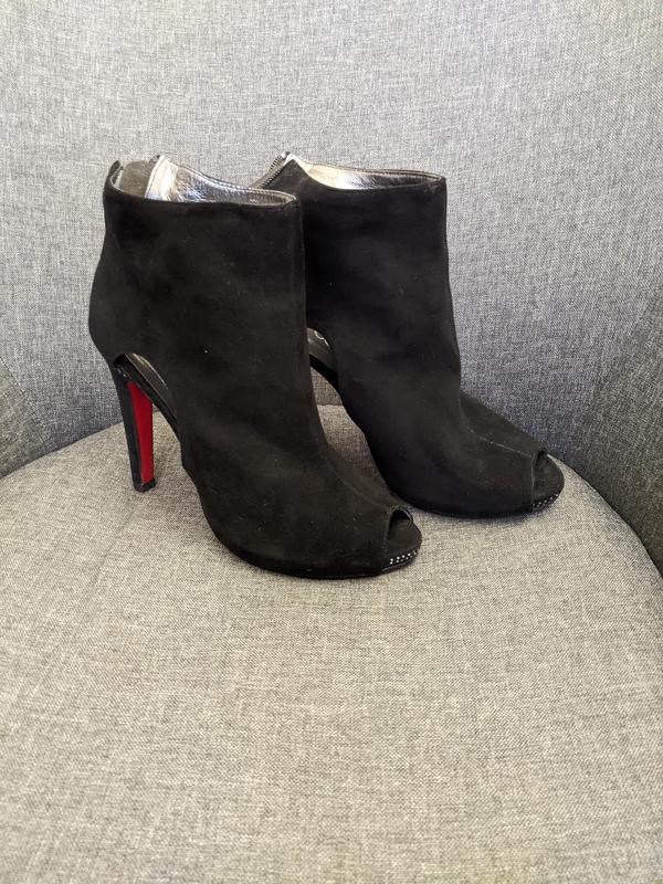 Ботильоны с открытым носком, на носке и у молнии отделаны стразамиМолния сзадиНатуральная замшаКаблук 11,5 смкрасная подошваРазмер 37, но могут подойти и на 38одевались два раза