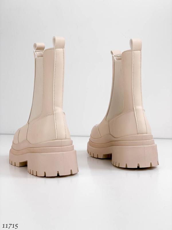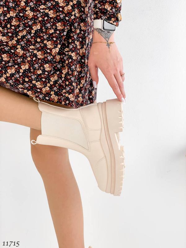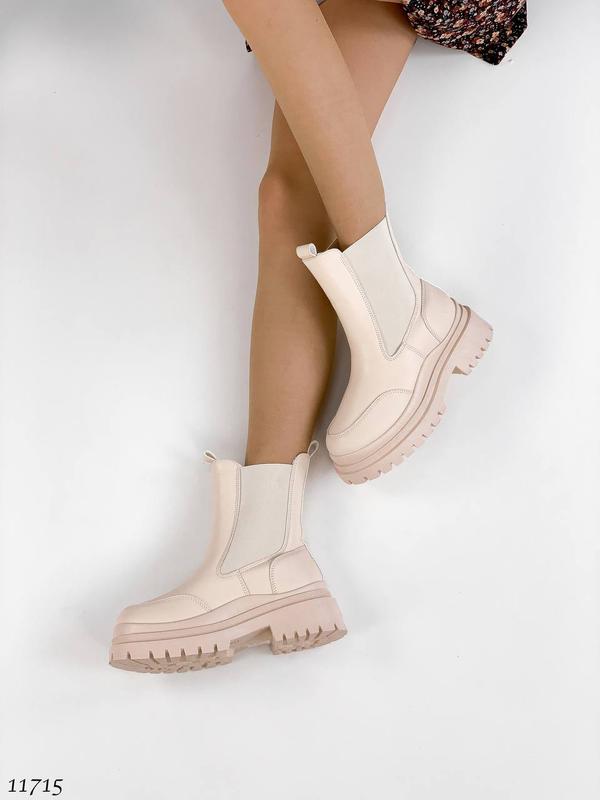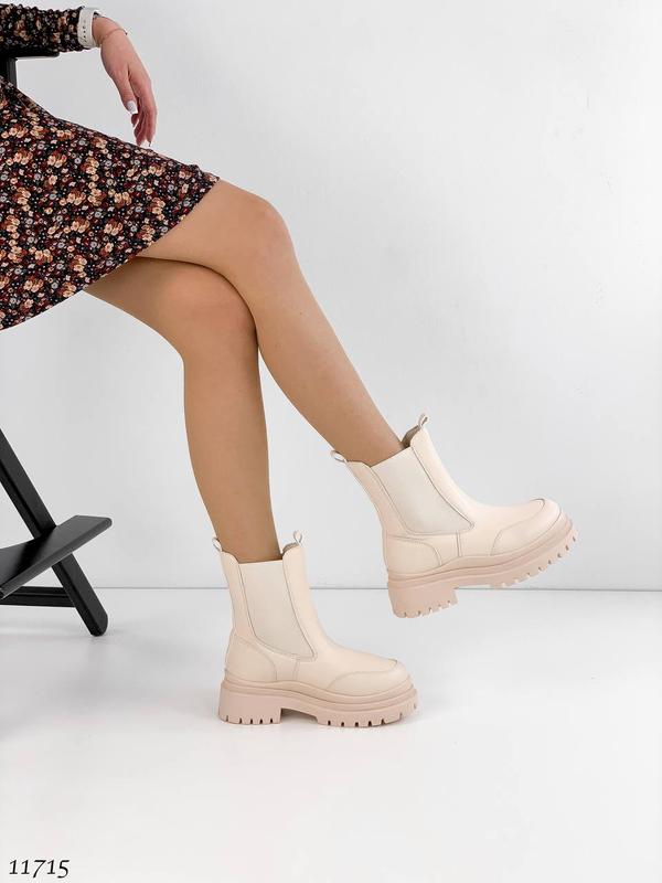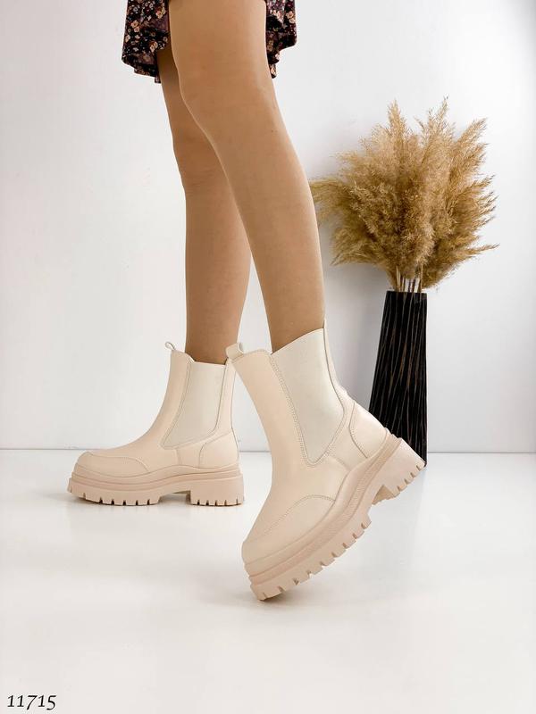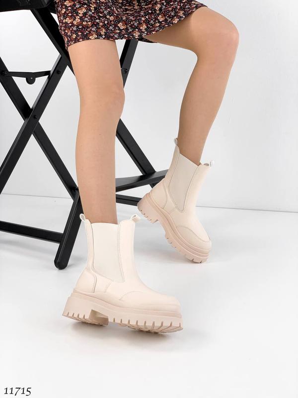 Демісезонні челсі колір: світлий беж матеріал: екошкіра,всередині: фліс,висота від п'яти 17 см,підошва: спереду 3,5 см,позаду 5 см,на середню та більш ширшу ніжку.(КНР)36= 23 см37= 23,5 см38= 24 см39= 24,5 см40= 25 см41= 25,5 см