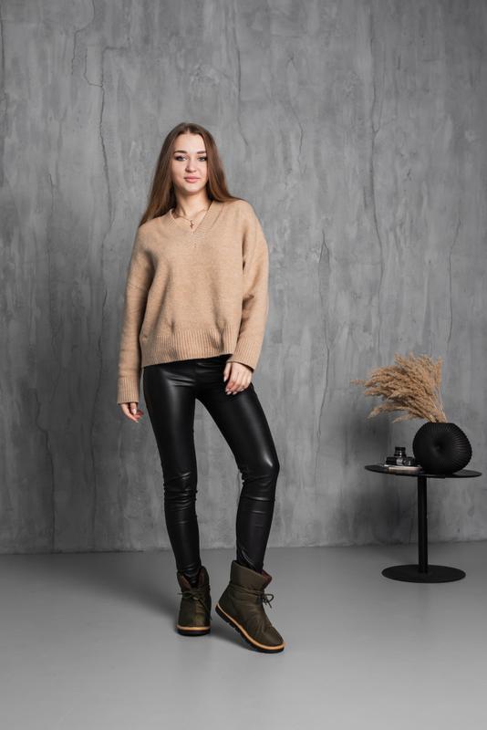 Модель аккуратно сидит на ножке. Дизайн этой модели в оливковом цвете. Женские