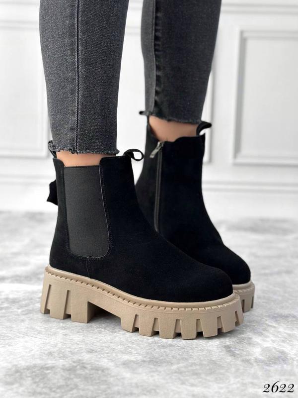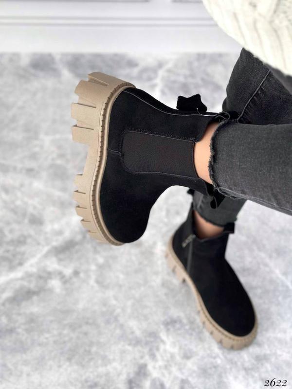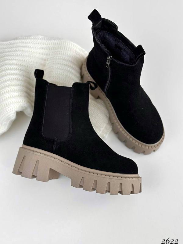 Черные женские зимние челси ботинки ботинки на бежевой подошве из натуральной замши...