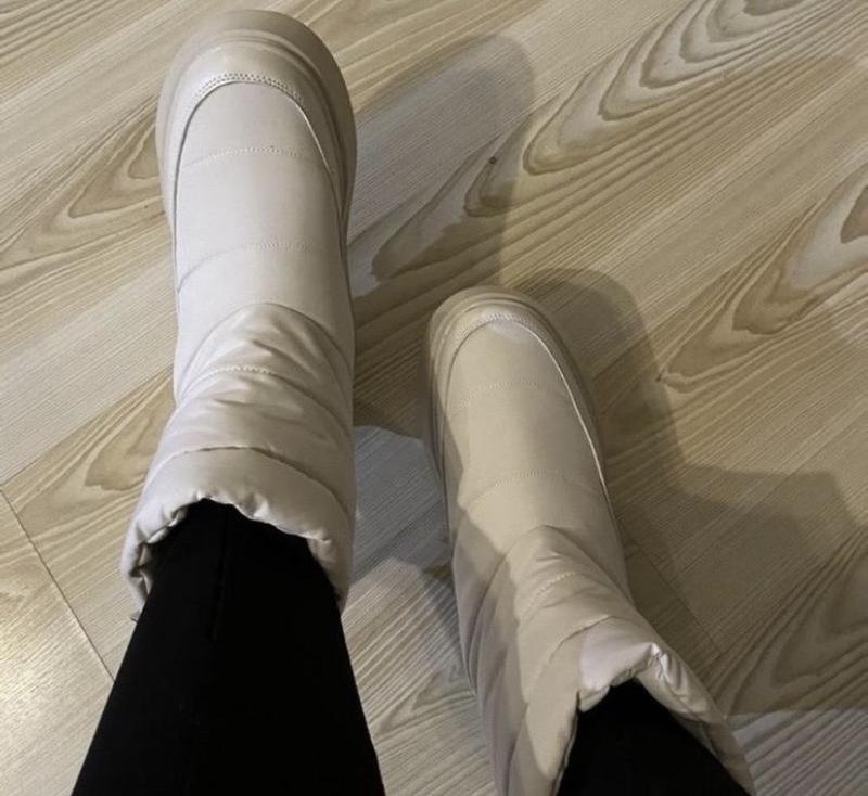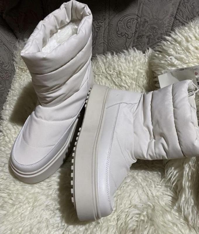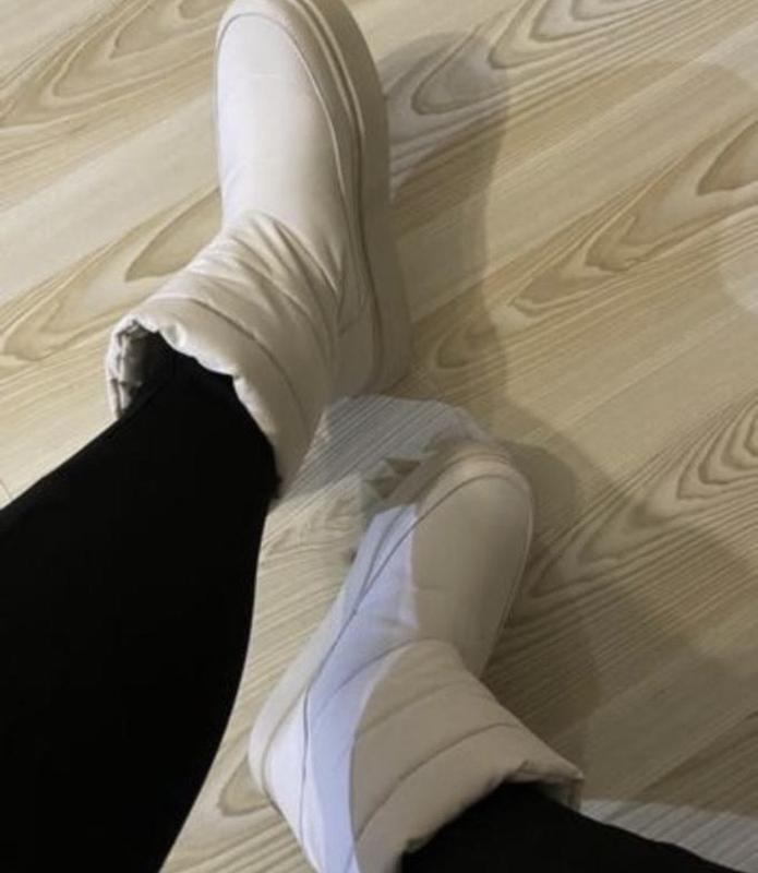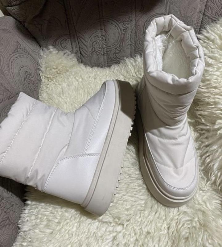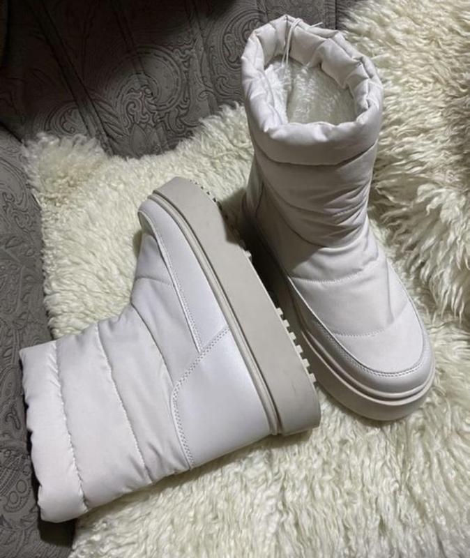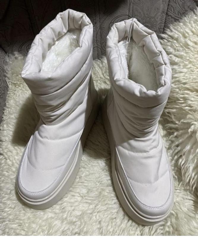 Новые, полностью утеплённые, светлые дутые сапожки. Одна из самых актуальных моделей. Подходят и на 40,5 р. Полномерные. Стельку не возможно измерить. Высота 23,5 с танкеткой. Танкетка 3.