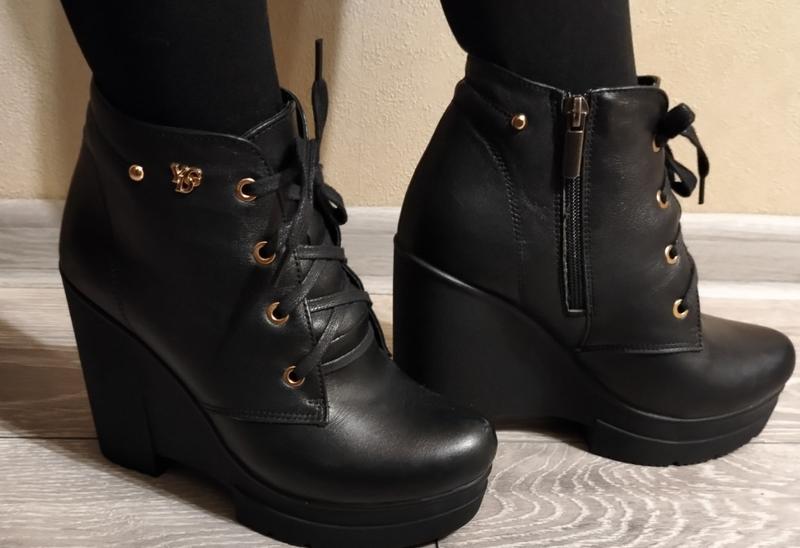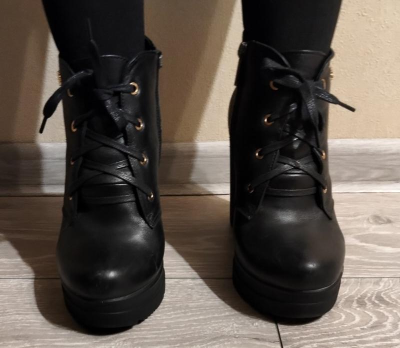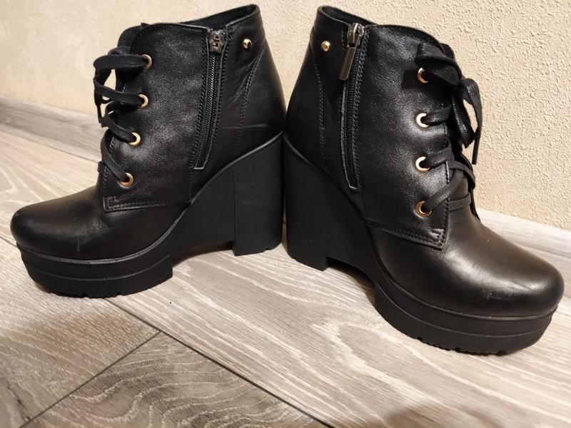 Ботильоны кожаные. Очень теплый (искусственный мех). Размер - 36, длина стельки - 23 см. Высота танкетки 10 см. Очень хорошее состояние, единственная проблема на правом ботеке сломалась смычок на молнии, поэтому боток следует обувать, пользуясь шнурками. Молния работает, но пальцами сложно тянуть бегунок на ноге.