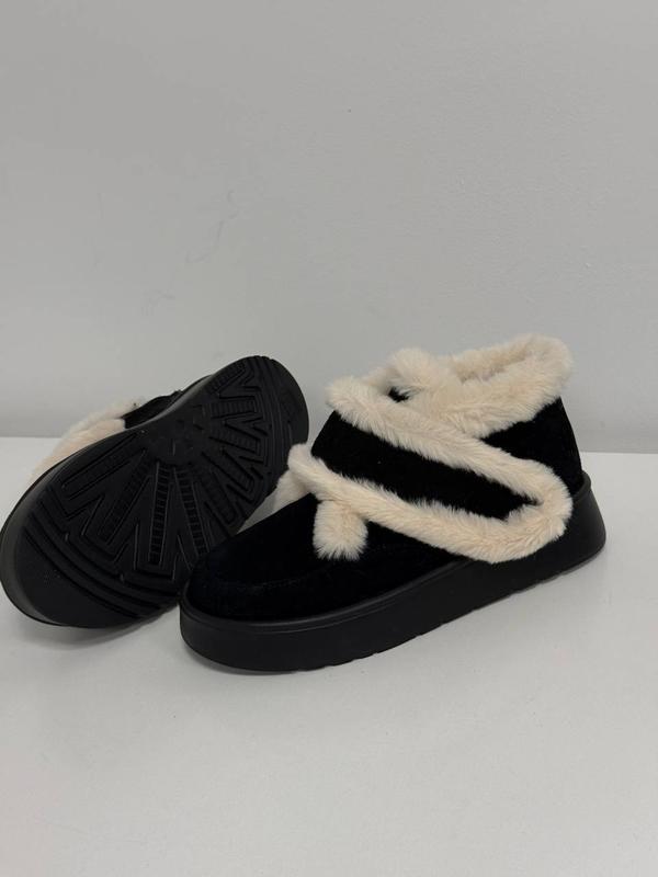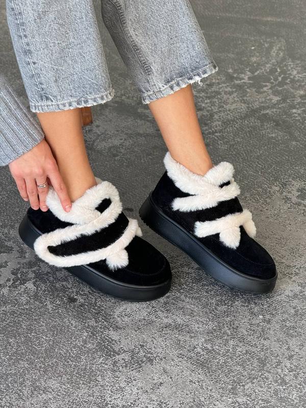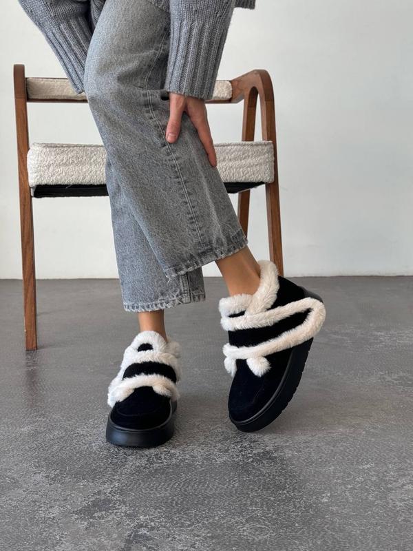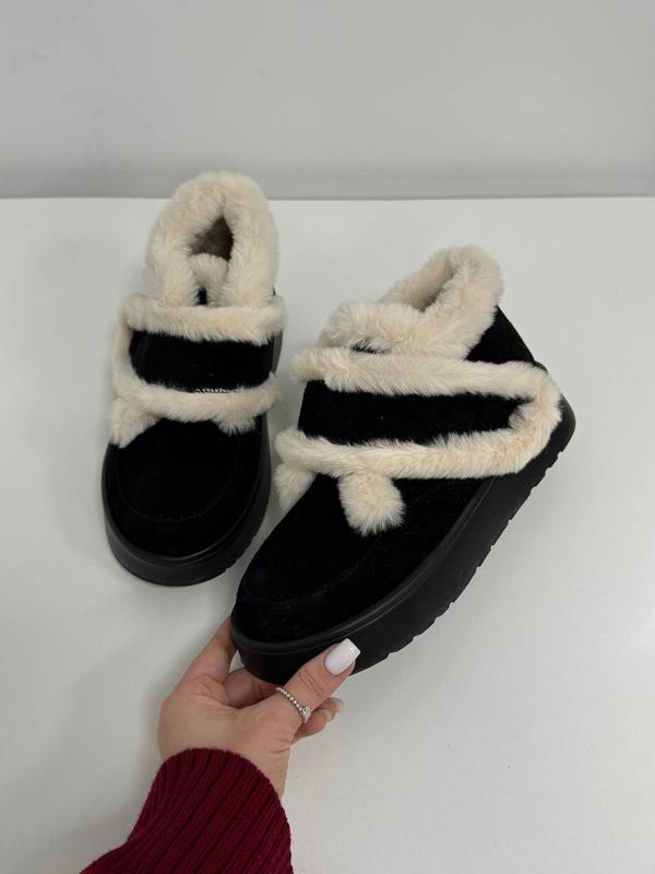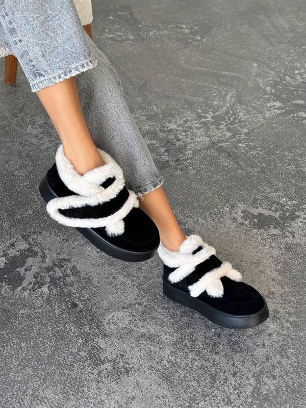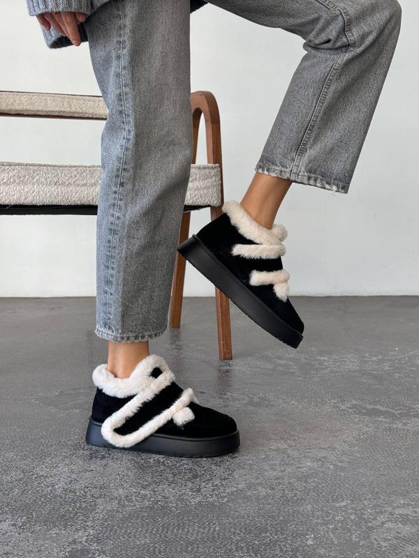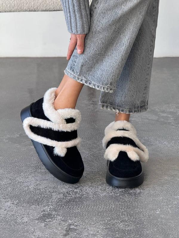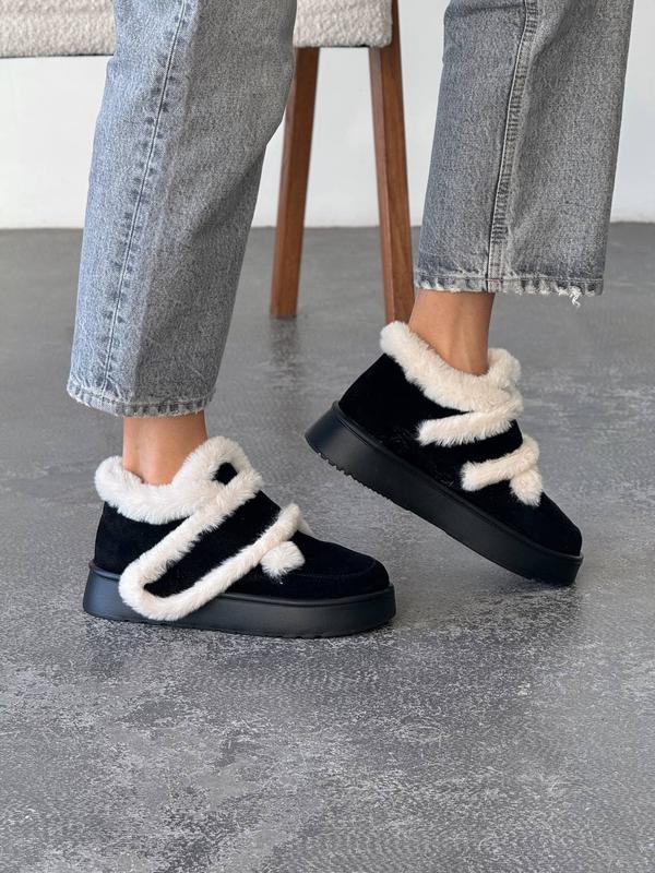 Код 11716Сноубутсы с опушкойцвет: ЧЕРНЫЙНАТУРАЛЬНАЯ ЗАМША + плюш. эко-кроликвнутри: мех в составе 30% шерстификсируются шнуровкой и липучкойна облегченной подошве EVAвысота от пятки: 8 смподошва: 3 см/ 4 смПроизводство - Украина
