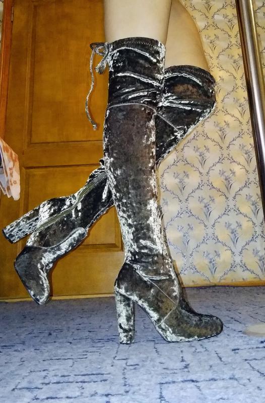 Шикарные демисезонные велюровые ботфорты на удобном каблуке. Брэнд - Fusion. Размер - 3 (36), по стельке - 23,5 см. Материал - качественный мраморный бархат. Цвет - тёмно-зелёный с переливом, изумрудный (очень красиво смотрятся). Высота от пола - 67 см, ширина в лодыжке - 23 см, под коленкой - 32 см, выше коленки - 35 см (регулируется шнурком). Ткань немного тянется. Высота каблука - 10 см. Застёгиваются на молнию (молния длиной до середины икры, а выше идут чулком). Состояние - новые.