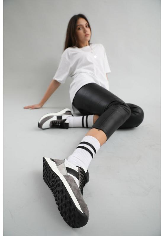 Красивые женские кроссовки белый+черный+серый цвета из натуральной замши и кожи на белой подошве отлично подойдут под любой образ.