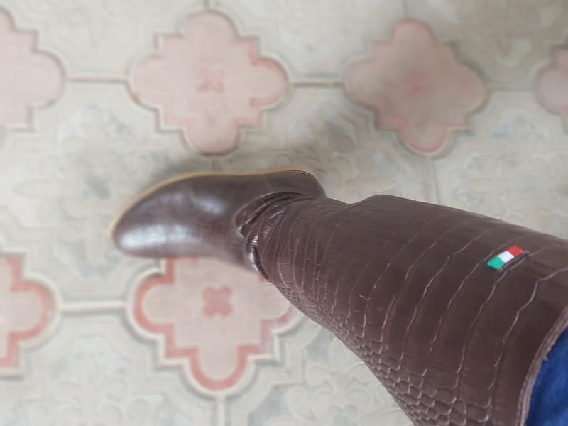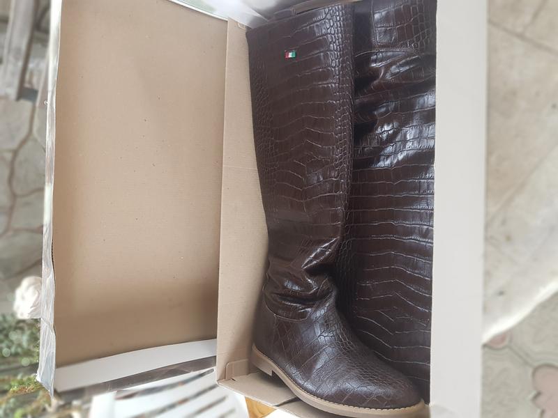 Акция в одну сутки!!Продам новые сапоги, очень красивая удачная модель трубы под кожу крокодила. Идут на среднюю и чуточку более широкую ножку, сверху объем 39-40 высота от пола 47. Утепление овчинка по всей длине но не толстая. Сапожки выглядят дорого и стильно. Идут на стопу 25.