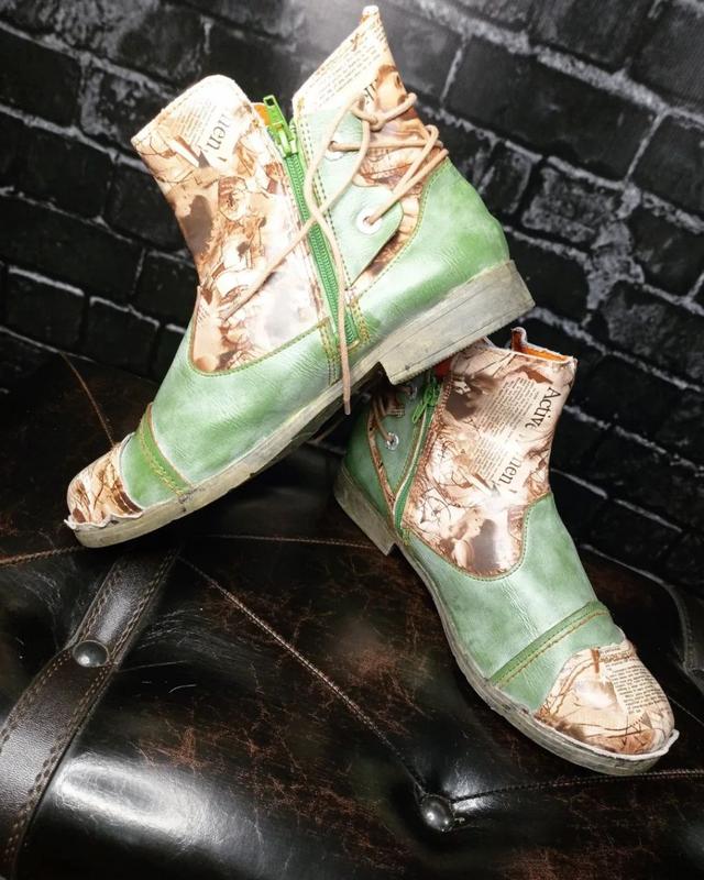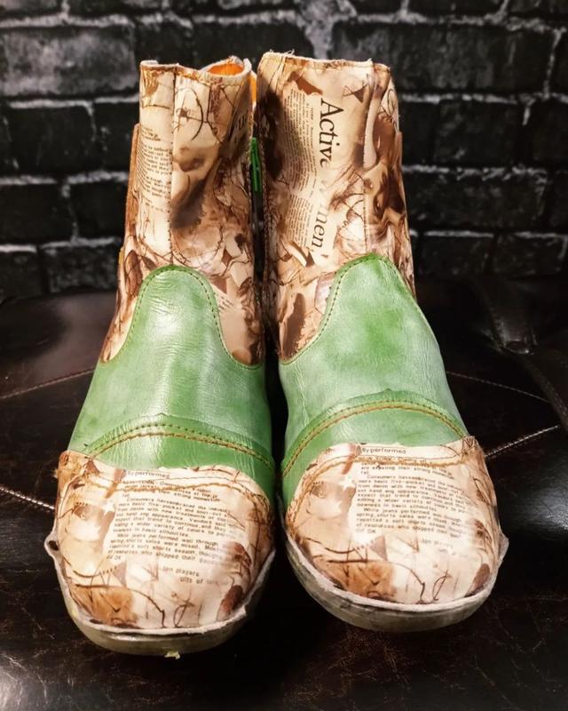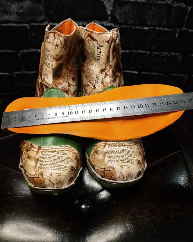 Эксклюзивные кожаные полусапоги TMA Eyes( Немецкая компания The TMA Company) made in Germany:size 40 ,НО СТЕЛЬКА ИДЁТ 26,5 ,что соответствует размеру 41( смотреть фото) состояние НОВОЙ ОБУВИ ( привезены с Франции, ЕВРОСТОК,магазин, были моделью на ветрине магазина, в носке не были , асфальт не ходили). УНИСЕКС ( подойдёт и парням, и девушкам) . Эксклюзивный рисунок по коже ГАЗЕТКА ( см.фото и видео) . Кожа средней плотности вычинка экстра класса ( корова), кожа в идеальном состоянии без следов эксплуатации и без всяких изъянов. Основная застёжка пластмассовая молния+ шнуровка на пятке регулировка ширины стопы. Стелька ортопедическая КОЖАНАЯ вытаскивается. Внутри подкладка кожаная оранжевого цвета натуральная, внутри бирки с указанием размера обуви и страны производителя. Подошва резиновая с эксклюзивным рисунком, цвет подошвы Винтаж , РЕТРО ( подошва в новом состоянии не ношеная,не хоженая,не топтаная ). Стильные, эффектные полусапоги, редкая модель ты мире обуви, подойдут как для езды на мотоцикле так и в повседневной жизни.