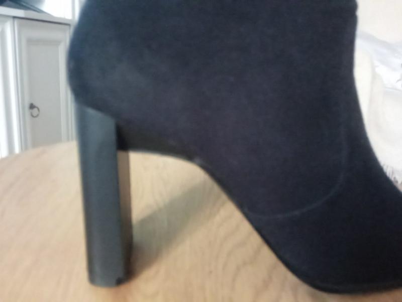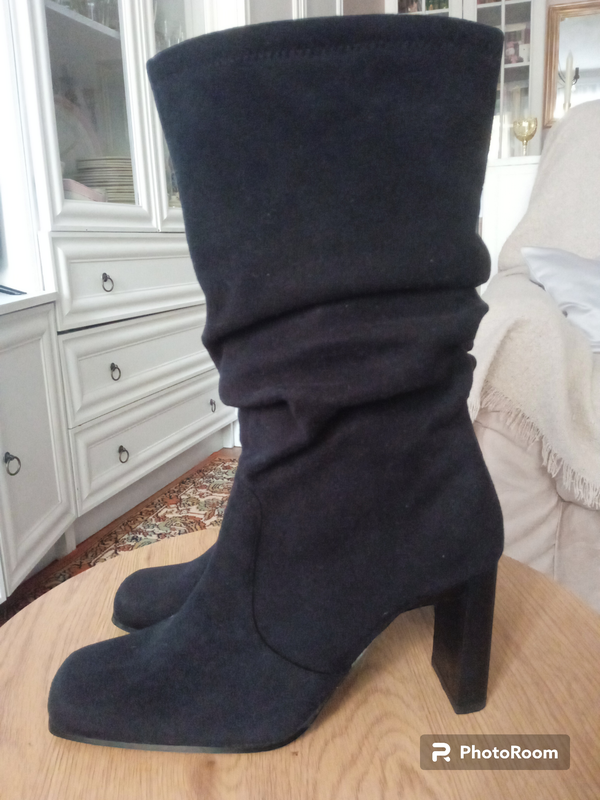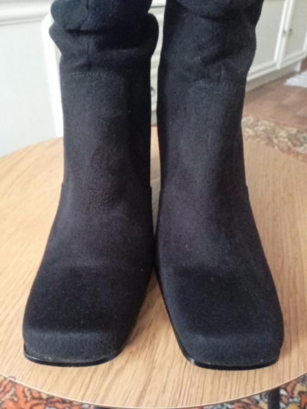 продам женские сапоги черного цвета из искусственной замши с квадратным мысом и очень удобными каблуками, хоть и не низкими.Мега удобная колодка.Стан идеально, без заломов, без царапин, и т.д. Размвр указан 4(37).