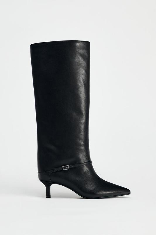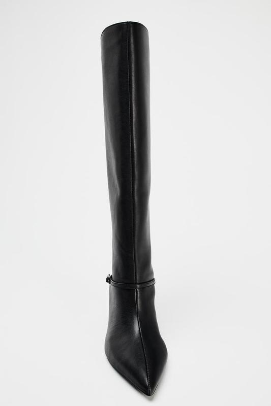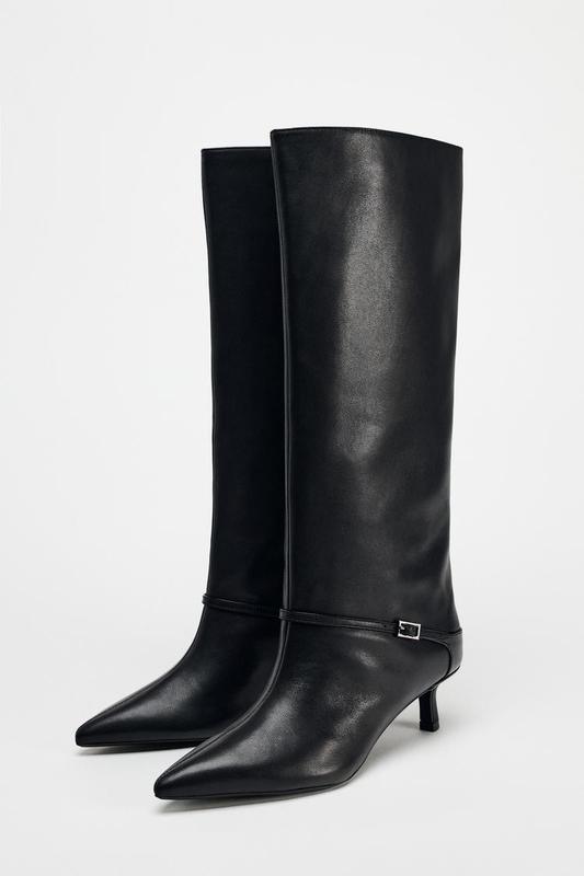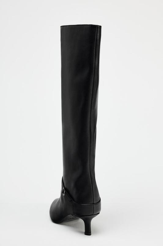 Сапоги на каблуках китен хил. Ремешок с пряжкой спереди. Строчки на верхней части. Острый носок.