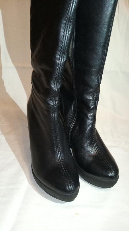 Зимние кожаные сапоги, внутри овчина. Размер указан 41, но идут на 40 и узкую ножку. Купила и обула 1 раз, мне жмут, не мой размер. Качество отличное. Танкетка 10см. Стелька 26.5см