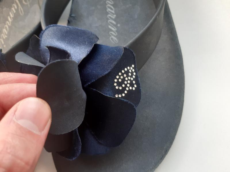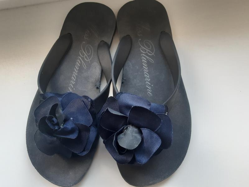 Великолепные тёмно- синие шлёпки от Blumarine. Italy. Италия. Оригинал. Есть нюанс - отвалился один цветочек. Его можно приклеить или пришить нитками. Размер указан 35/36. Стелька 24 смОчень приятные тактильно. Покупала за 100$