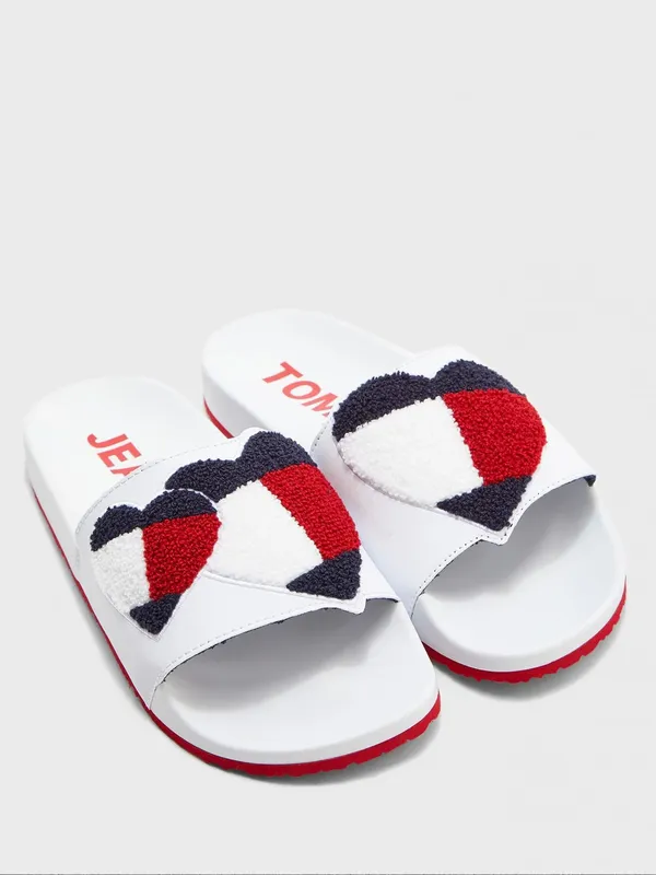 Tommy Hilfiger Valentines женские шлепанцы белого цвета с изображением сердечек с фирменным логотипом.Особенности:• материал – полиуретан• резиновая подошва• подкладка из хлопкаДлина стельки 24 см