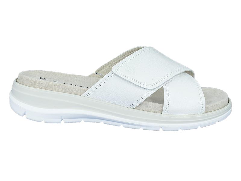 Комфортные женские шлепанцы немецкого производства. Выполнены из натуральной кожи в белом цвете. Регулируются с помощью липучки. Стелька съемная, ее можно стирать. Германия, натуральная кожа, белый, лето