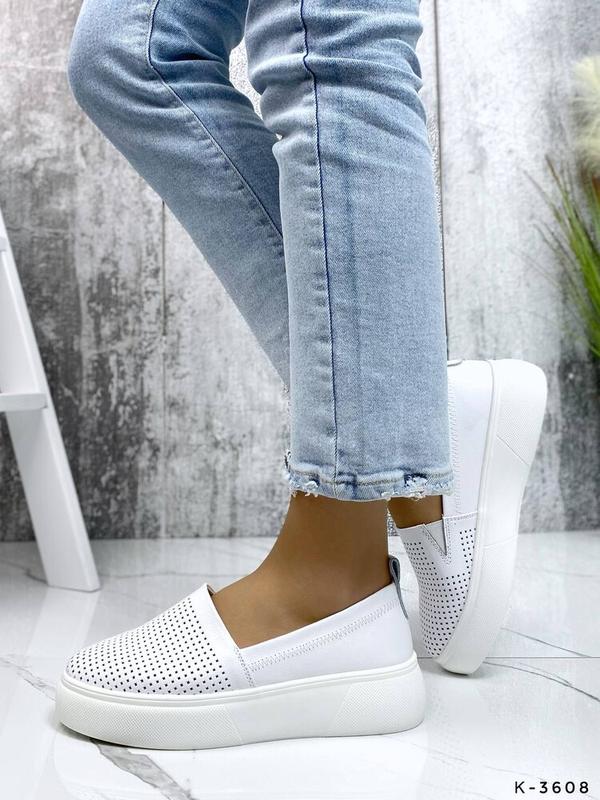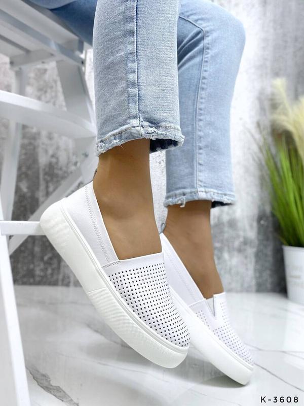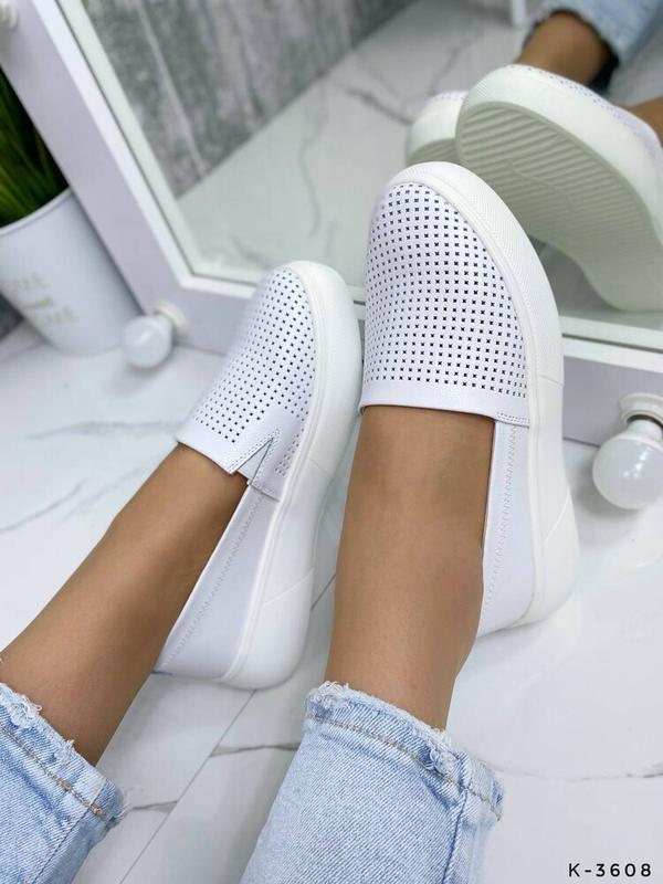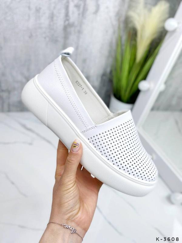 Белые слипоны из натуральной кожи. Материал – натуральная кожа, перфорация сквозная. Слипоны удобные, легкие и довольно мягкие. Подошва не чувствуется, а ножкам будет комфортно и удобно. Стильная и модная обувь по цене ниже, чем у конкурентов.
