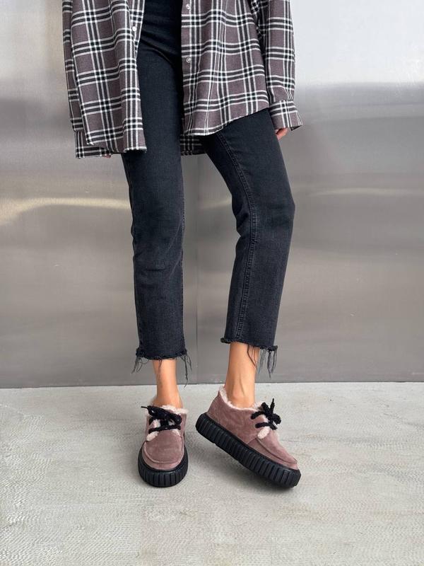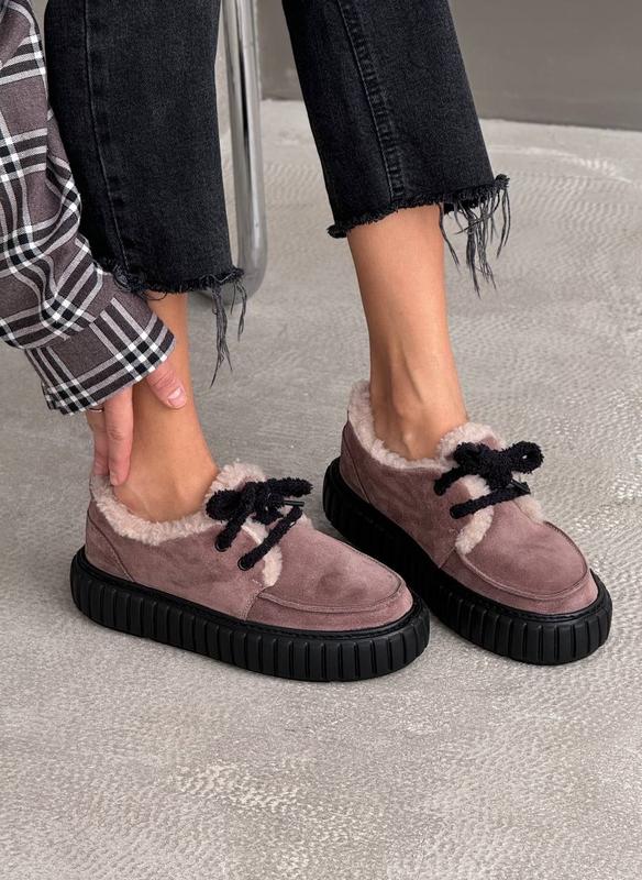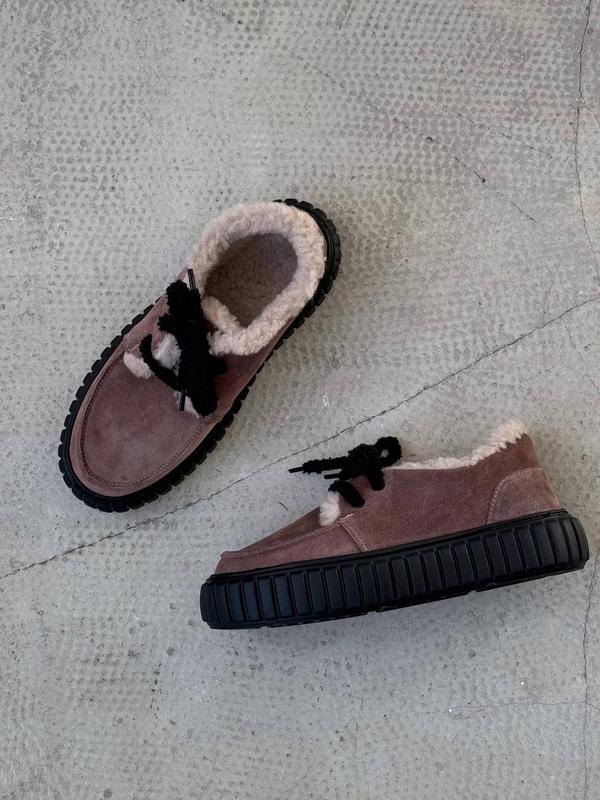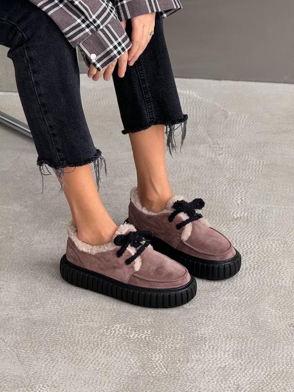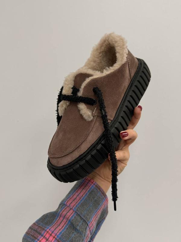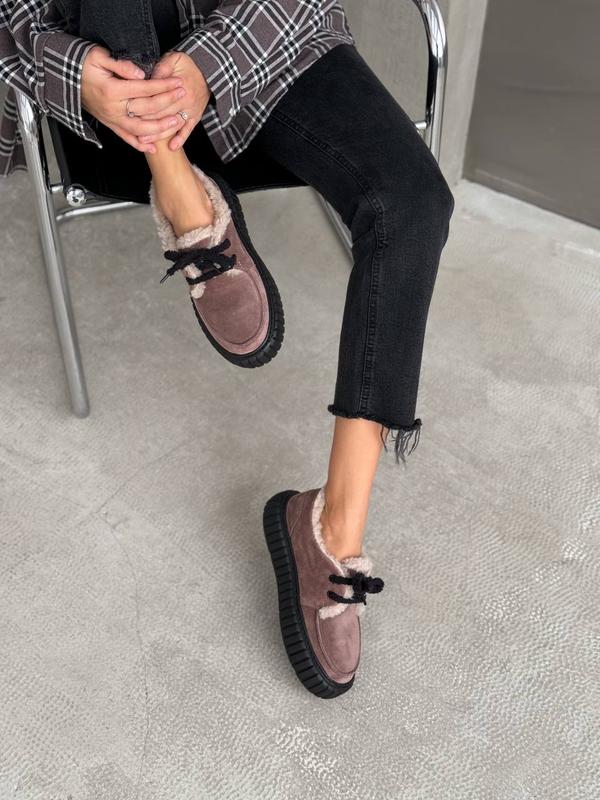Код 11589 Зимние лоферы на шнуровке цвет: МОККО (прошитые) НАТУРАЛЬНАЯ ЗАМША внутри: мех в составе 30% шерсти подошва из невероятно легкой ЭВА, супер-легкая высота подошвы: 4 см/4,5 см Производство - Украина