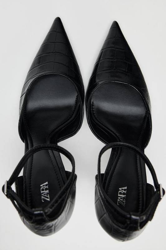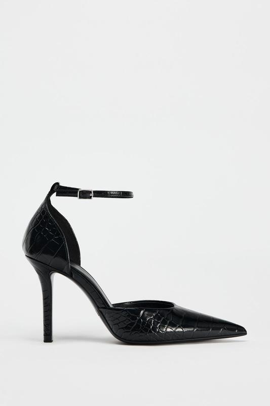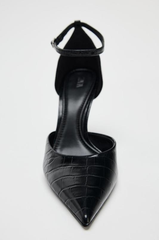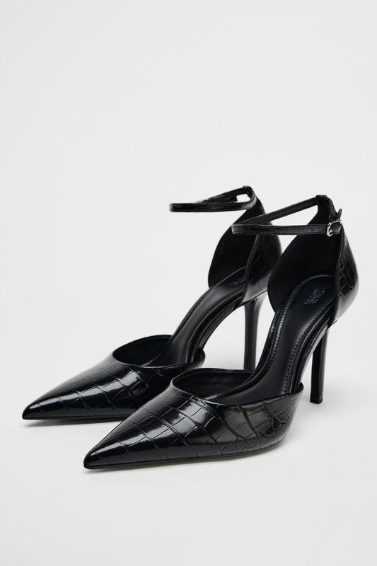 Туфли на тонких каблуках. Животный принт на верхней части. Ремешок с пряжкой для регулировки на щиколотке и острый носок.