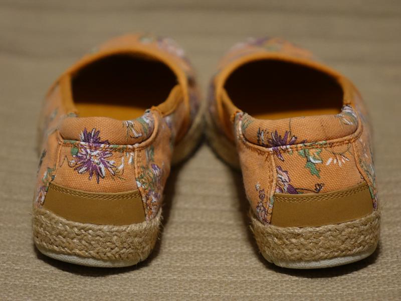 Верх изделия выполнен из плотного мягкого канваса оранжевого цвета с ярким цветочным принтом, а вставка в нижней части тканного задника выполнена из гладкой натуральной кожи цвета молочного шоколада. По нижнему краю проходит своеобразный кант, выполненный из плетеной натуральной пеньки. По верхнему краю эспадрильи обшиты мягкой тесьмой оранжевого цвета. На наружной стороне боковой поверхности изделия, ближе к заднику, блестящими шелковистыми нитками бутылочного цвета вышит логотип бренда.