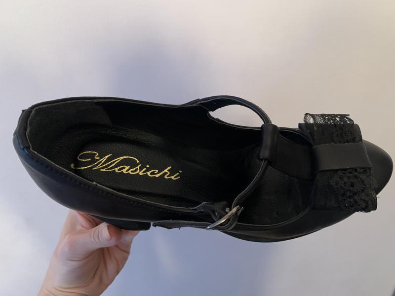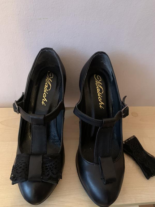 Очень качественная работа и кожа. Массивный и удобный каблук 9 см. Стельки 24,5 {на 38р.}. Подойдут скорее на узкую ногу. Подъем регулируется ремешком. Декоративный бант кожи и кружева съемный. Очень стильные и интересные туфельки в состоянии новых.
