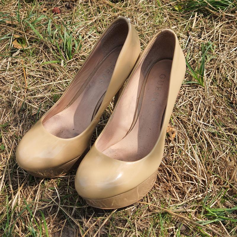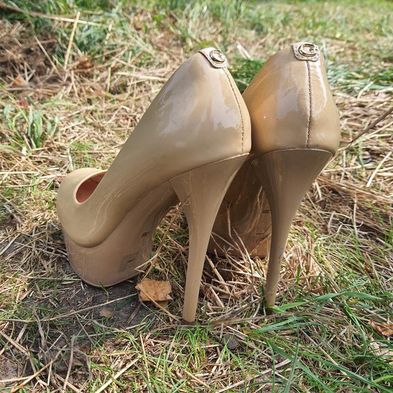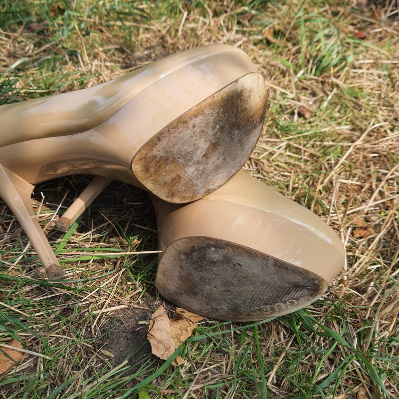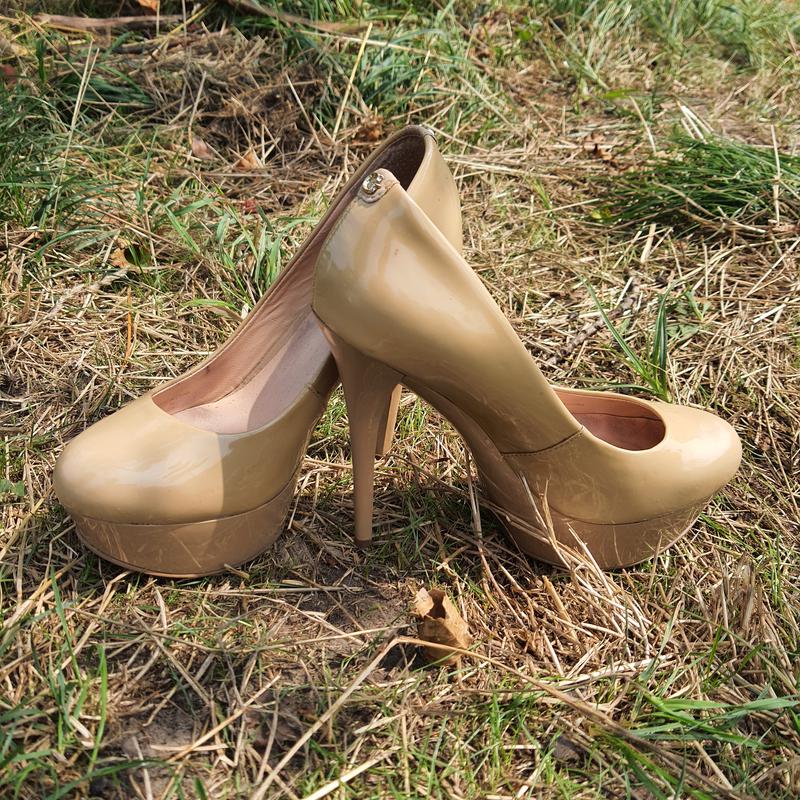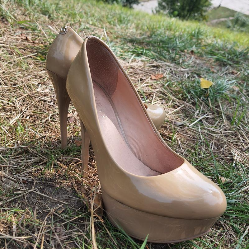 Обувались один раз. На каблучке правой туфли есть царапина - можно исправить лаком для ногтей, либо отдать мастеру, или вообще не трогать, так как она практически незаметна. Подошва и набоечка не стерты.