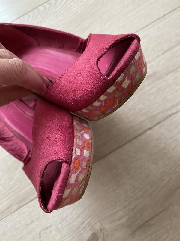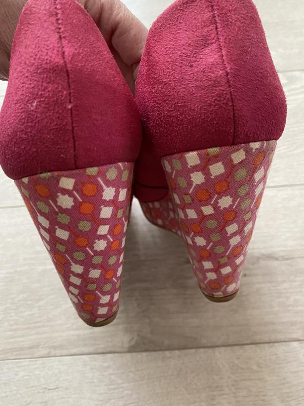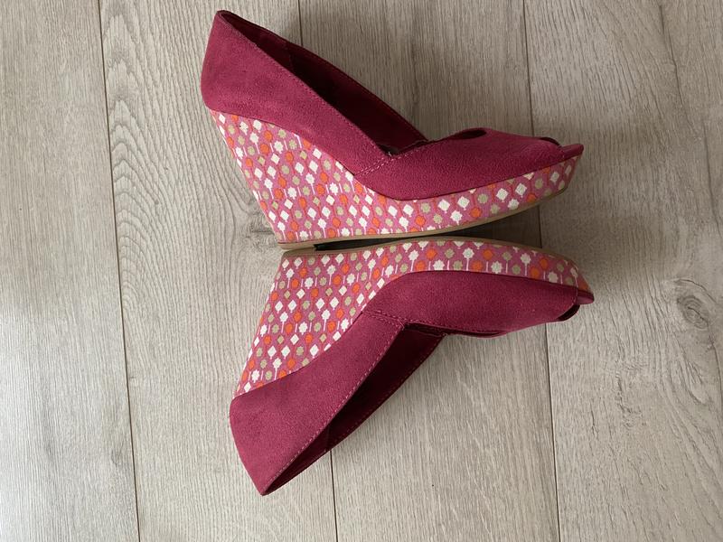 Фото на теле нет Танкетки высокие в абстрактный принт Носики округлённые слегка заострённые открытые Розовые замшевые Стелька 25,5-26 см)Высота танкетки сзади 11 см)Высота танкетки впереди 2,2 см)Ширина подошвы 7,1 см)