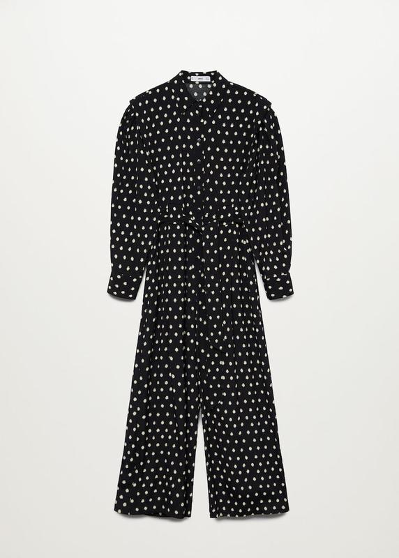 Прямий крій, струмуюча тканина, візерунок у горошок, комір сорочки, довгий рукав, регульований пояс, застібка на ґудзиках спереду