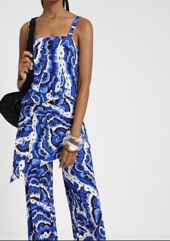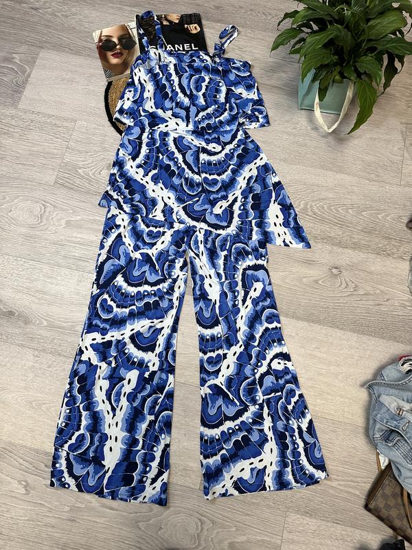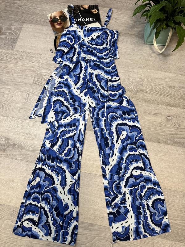 Комбинезон из лайкры с цветочным принтом. Широкие штанины и многослойный верх с широким регулируемым