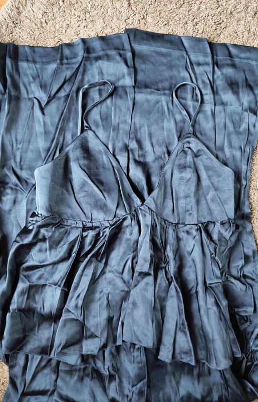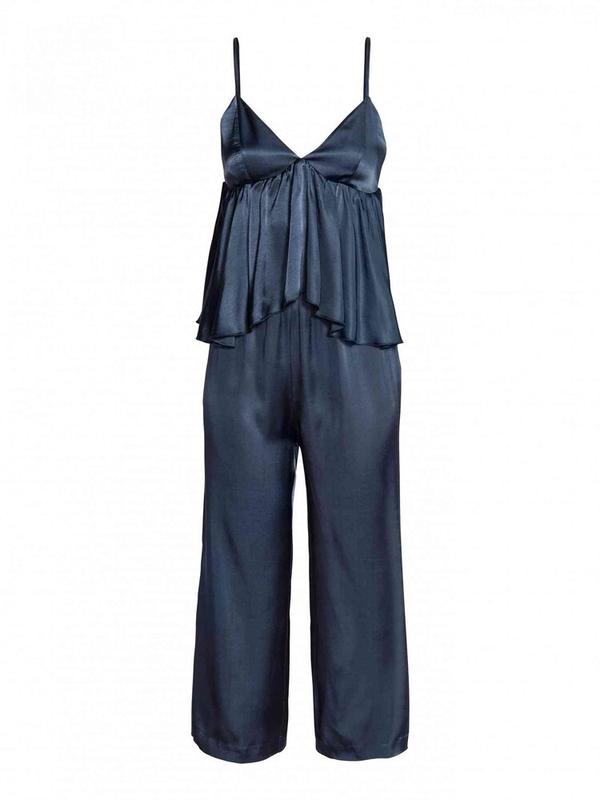 Комбинезон из плетеной ткани с блеском. Сверху на подкладке, узкие регулируемые бретели и фигурные чашечки с декоративной оборкой внизу. Потайная молния сбоку, низкая промежность и прямые штанины длиной до щиколотки.