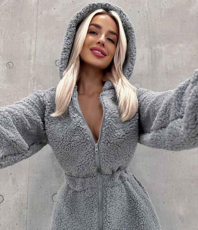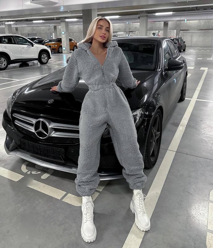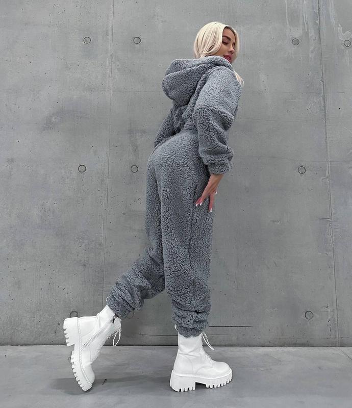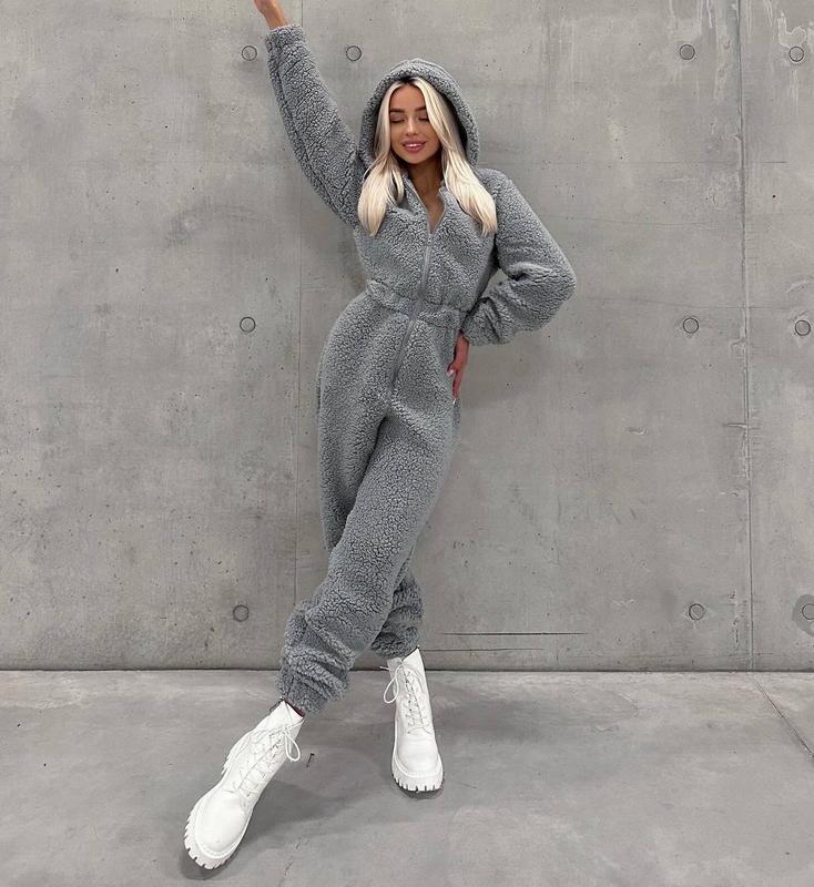 ❤️ шикарный теплый плюшевый комбинезон тедди тенды мех жэнский брючный плющ с капюшоном серый